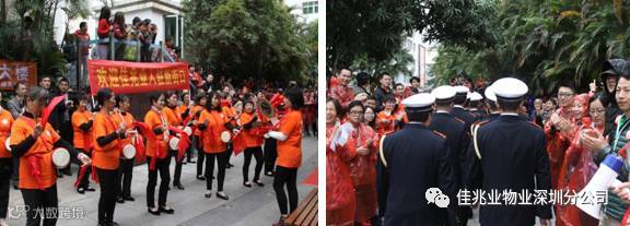 由小区业主自发组成的花鼓队表演作为开场节目,庆祝佳兆业物业的正式进驻,业主们夹道欢迎新物业管理队伍入场。新街口业委会代表主持了此次接管仪式,首先由业委会主任李先生代表全体业主致词,表示对新物业的进驻接管期盼已久,对佳兆业物业充满信心。
