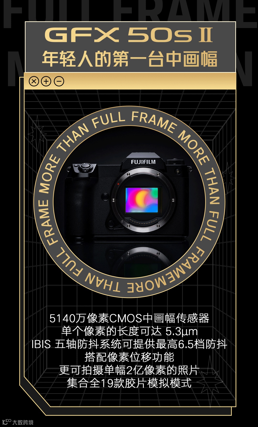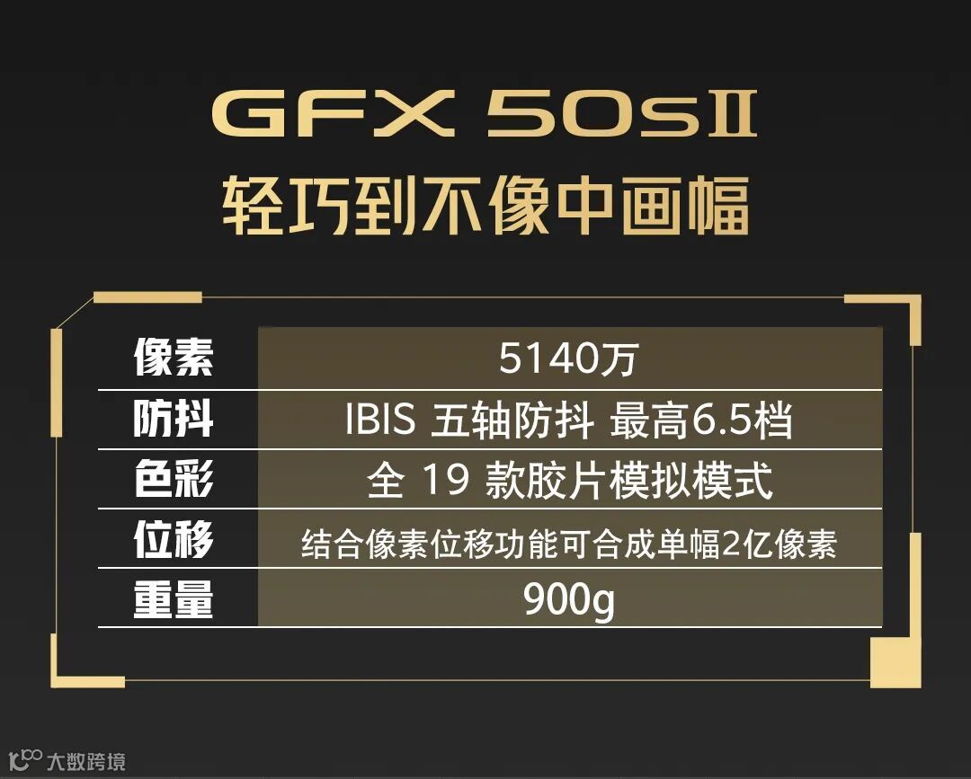 这台全新的 GFX50S II 的机身只有 900g,配备了 5140w像素的CMOS. 在减轻了机身重量的同时,也保证了画质。