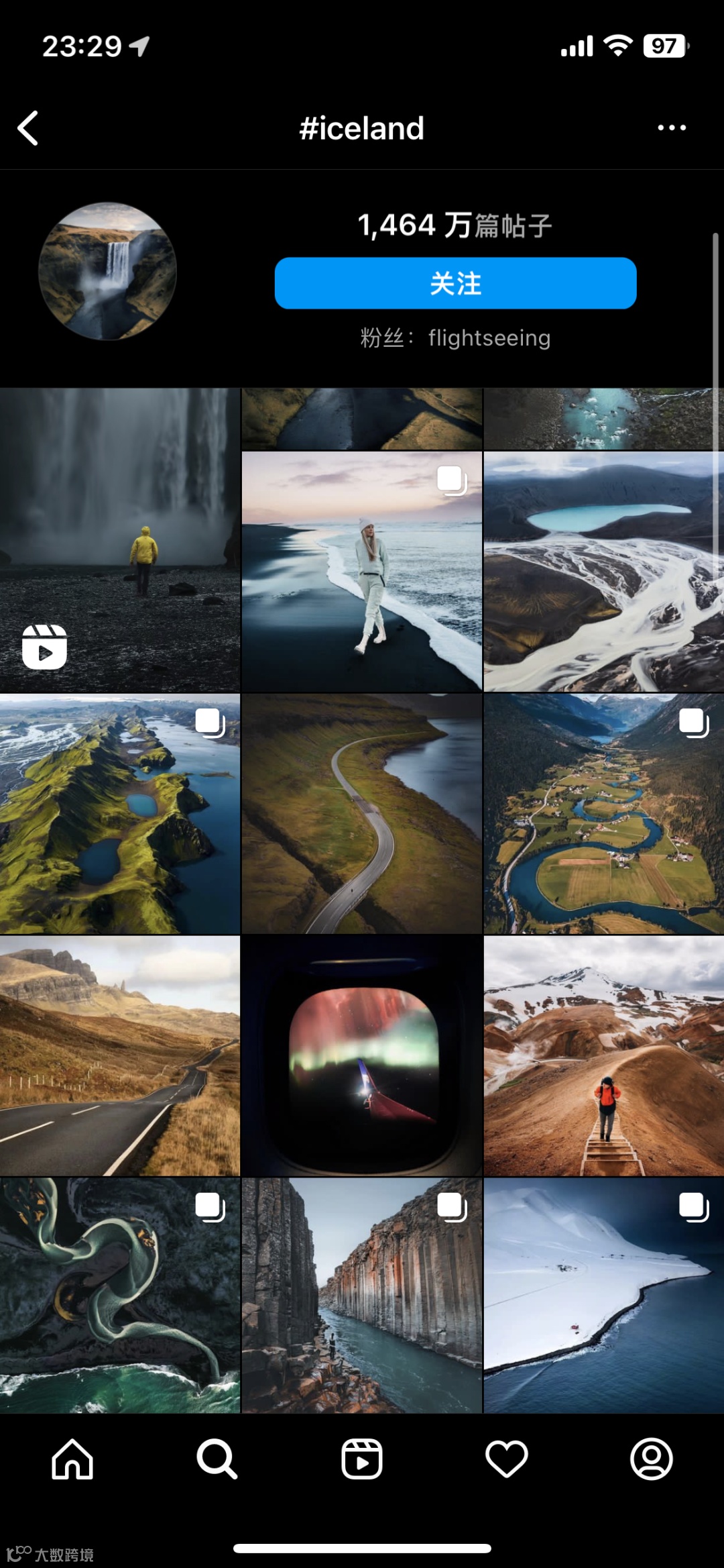 因此,我们就可以从维格镇出发,然后一路朝着东边往上去拍。我们还可以从谷歌地图上去搜索目的地,就可以得到目的地的照片。或者可以从各个平台上搜索冰岛,你可以看到照片所拍摄的位置在哪儿。大概的位置确定之后,你可以结合你自己的想法在现场进行不同的构图,去拍出一些不一样的内容。