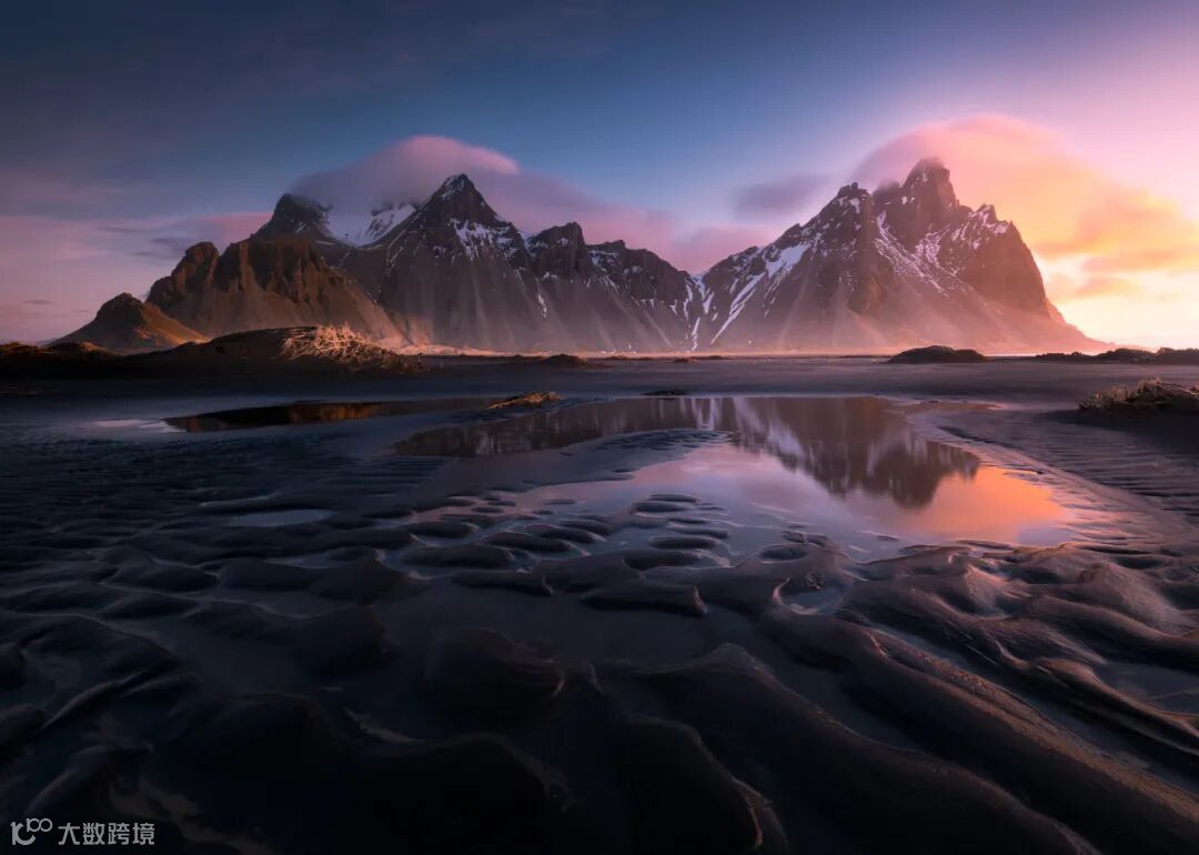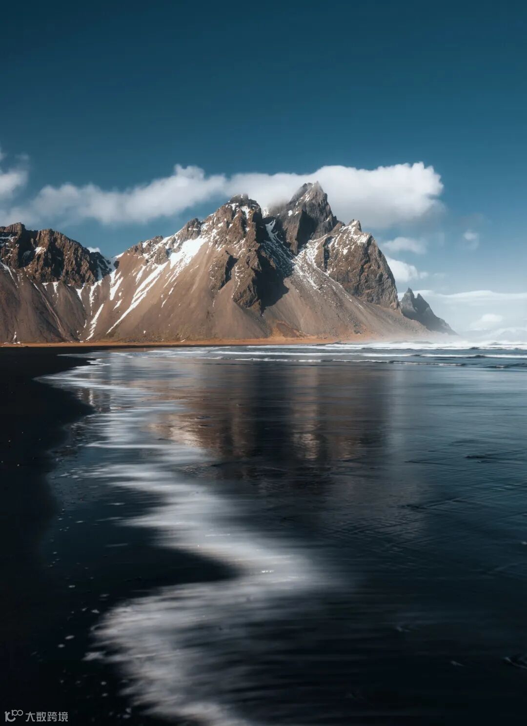 这是冰岛的蝙蝠山。因为在海边,所以我想让前景有一些海水、线条的参与,于时就到了这个沙滩边上拍摄。当时我的设想很简单,就是找一个有引导线的方式去构图,能够将引导线延伸到远处的山上。这里拍摄的时候可以用ND镜,它可以让我们的水更加丝滑,这里采用的构图方式就是横构图。