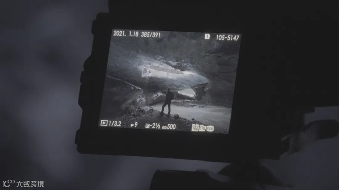 在拍摄冰洞的时候,首先要使用广角去构图,越广的镜头越能够让整个画面有一种视觉冲击力。拍摄冰洞的时候对相机的要求也比较高,因为冰洞光比会很大,外面很亮里面很暗,所以我们要使用三脚架去拍摄。这里我使用A挡,因为要使用三脚架,所以ISO只有100。在拍摄时为了保存它的高光细节,可以拍得欠曝一点,因为GFX中画幅的动态范围是非常高的,所以在欠曝几挡的环境下依然可以拉回来。
