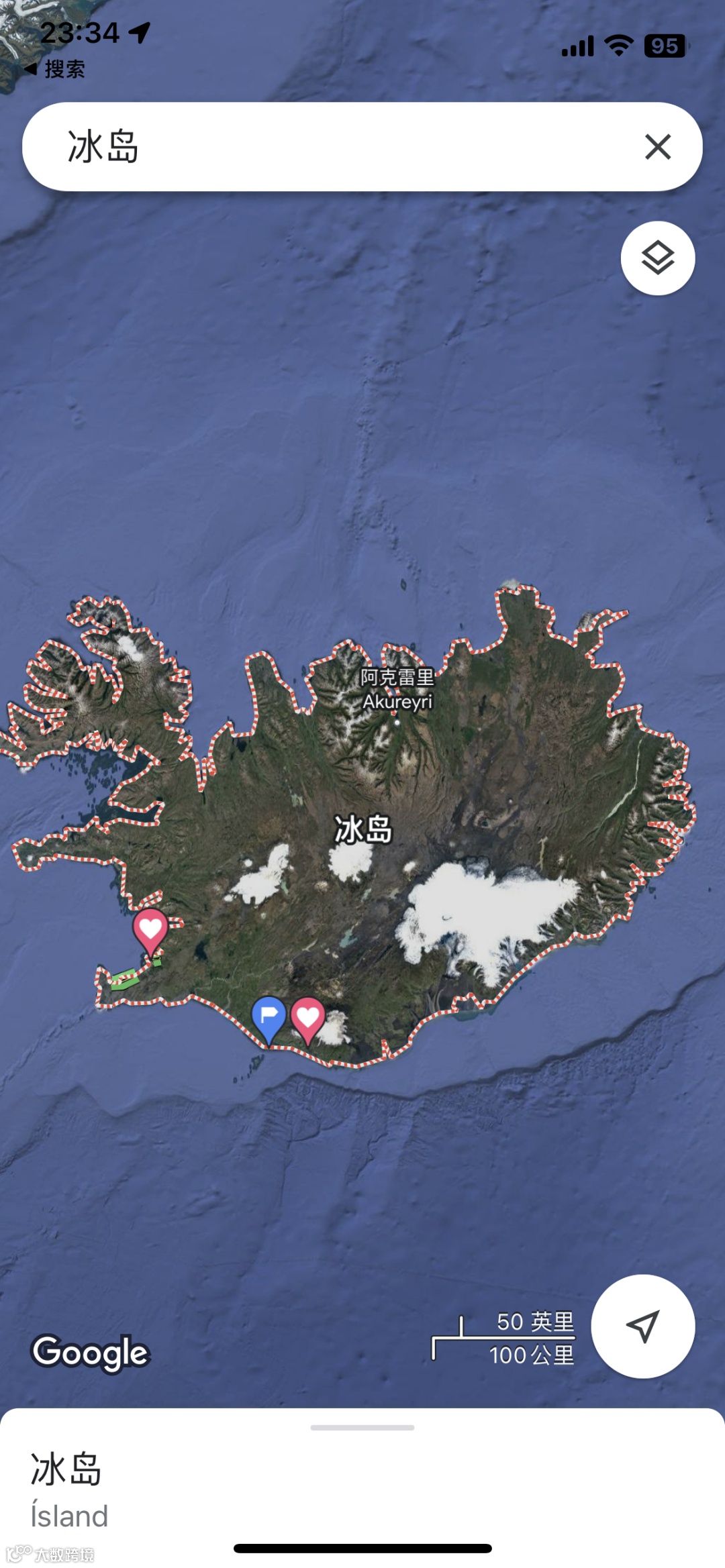 我们可以输入相应的目的地,先打开地图看冰岛这一圈。一般冰岛可以从左边环岛或者从右边环岛,但如果是冬天基本上很难去环岛,因为北部的气候比较恶劣,很多地方路况会很差。我们冬季拍摄会集中在东部,西部的峡湾也不能去。