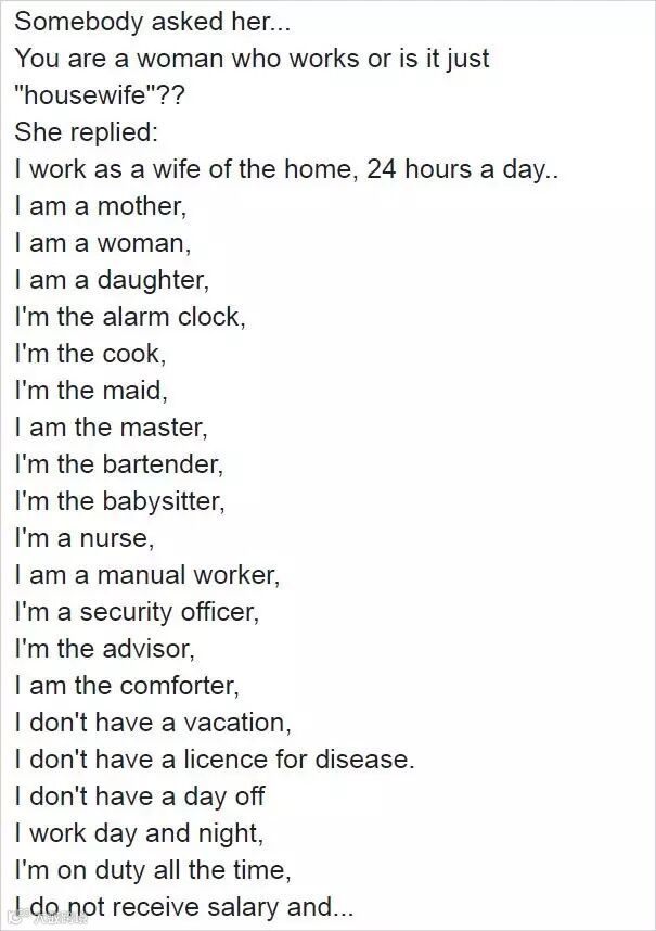 每当有人问一个家庭主妇,怎么看待自己在家里当个“家庭主妇”时,她是这么回答的: