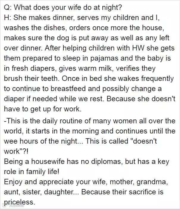 丈夫:她给我和孩子做晚饭,然后洗盘子洗碗,再收拾一遍房子,喂狗,帮孩子做作业之后,她要帮孩子们换上睡衣然后哄他们上床睡觉。