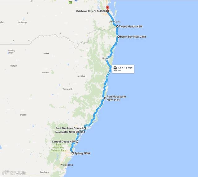 途径主要城市:悉尼(Sydney)-中央海岸(Central Coast)-纽卡素(Newcastle) -史蒂芬斯港(Port Stephens)-麦奎利港(Port Macquarie)-拜伦湾(Byron Bay)-堤维德岬(Tweed Heads)-布里斯班(Brisbane)