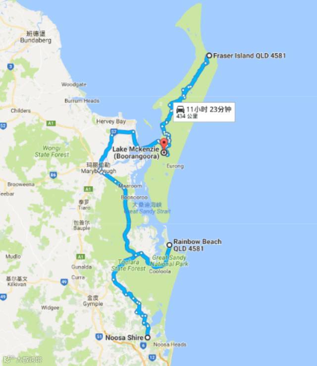 线路:努沙(Noosa)-彩虹海滩(Rainbow Beach)--费沙岛(Fraser Island)-白沙湖(Lake McKenzie)