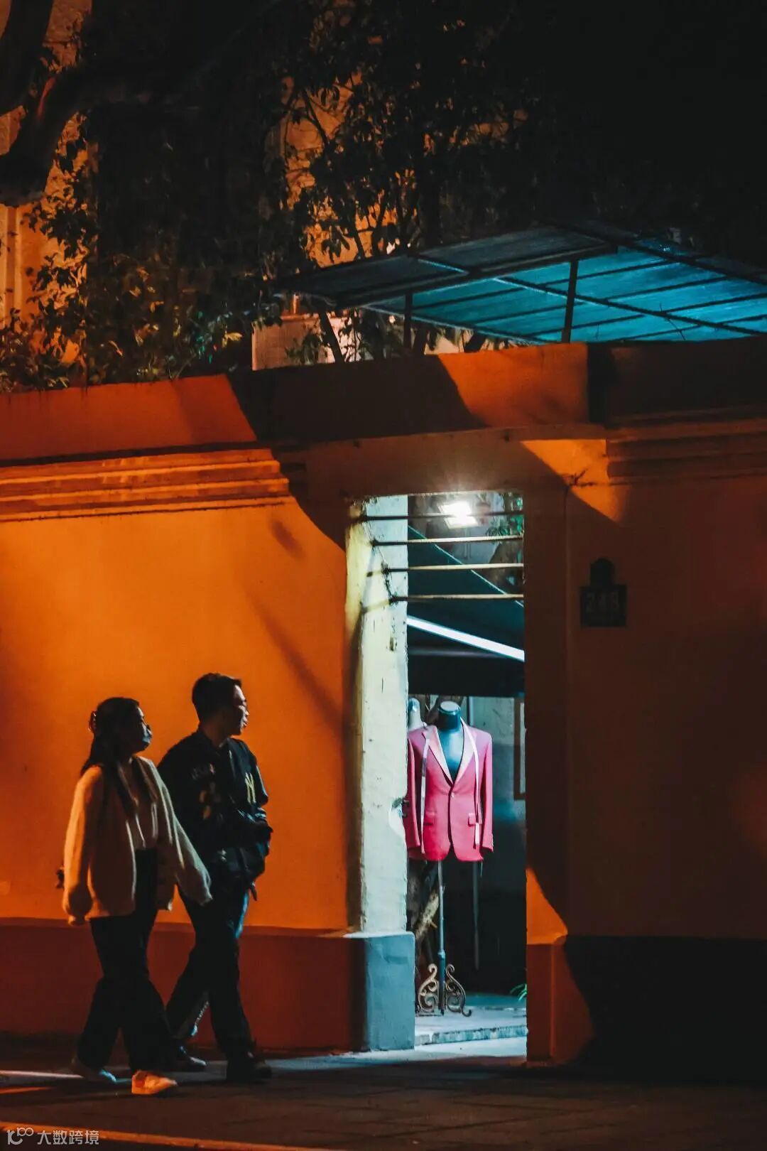 夜景扫街多考虑光影,寻找有灯光的地方,老式暖黄色灯更易出片,明暗、冷暖对比轻松调出青橙色调。