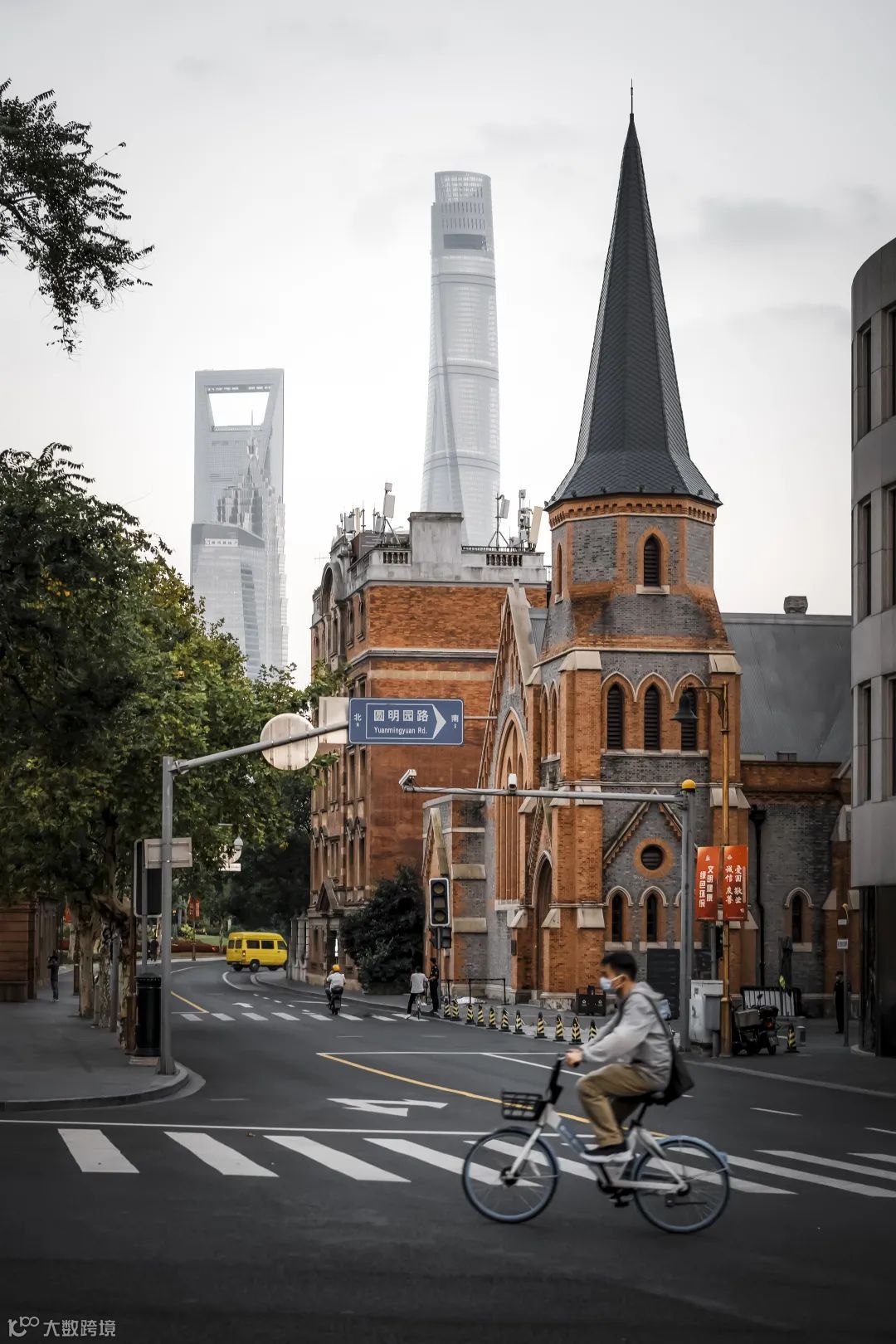 富有年代感的红砖教堂,同现代化的上海中心建筑,形成了鲜明的对比。而阴沉的天气恰恰使二者在画面中相互融合,结合人物一同捕捉入画,刻画出了每层的细节,每一层的重点都得以展现。