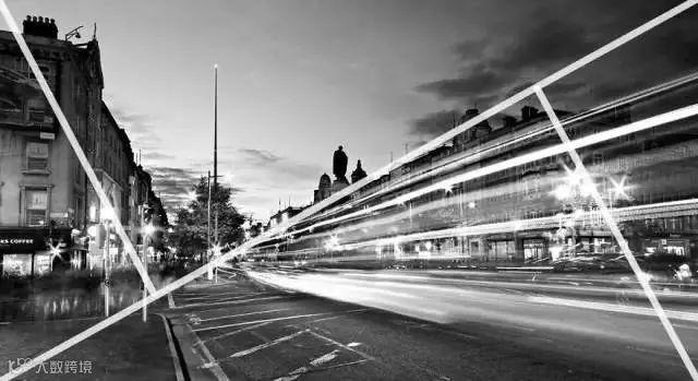 黄金三角形构图和三分法的方式非常相似。但并非矩形网格,我们把画面对角线连接,分割成三角形。这种创作方式帮助我们形成技巧六中的元素“动态张力”。