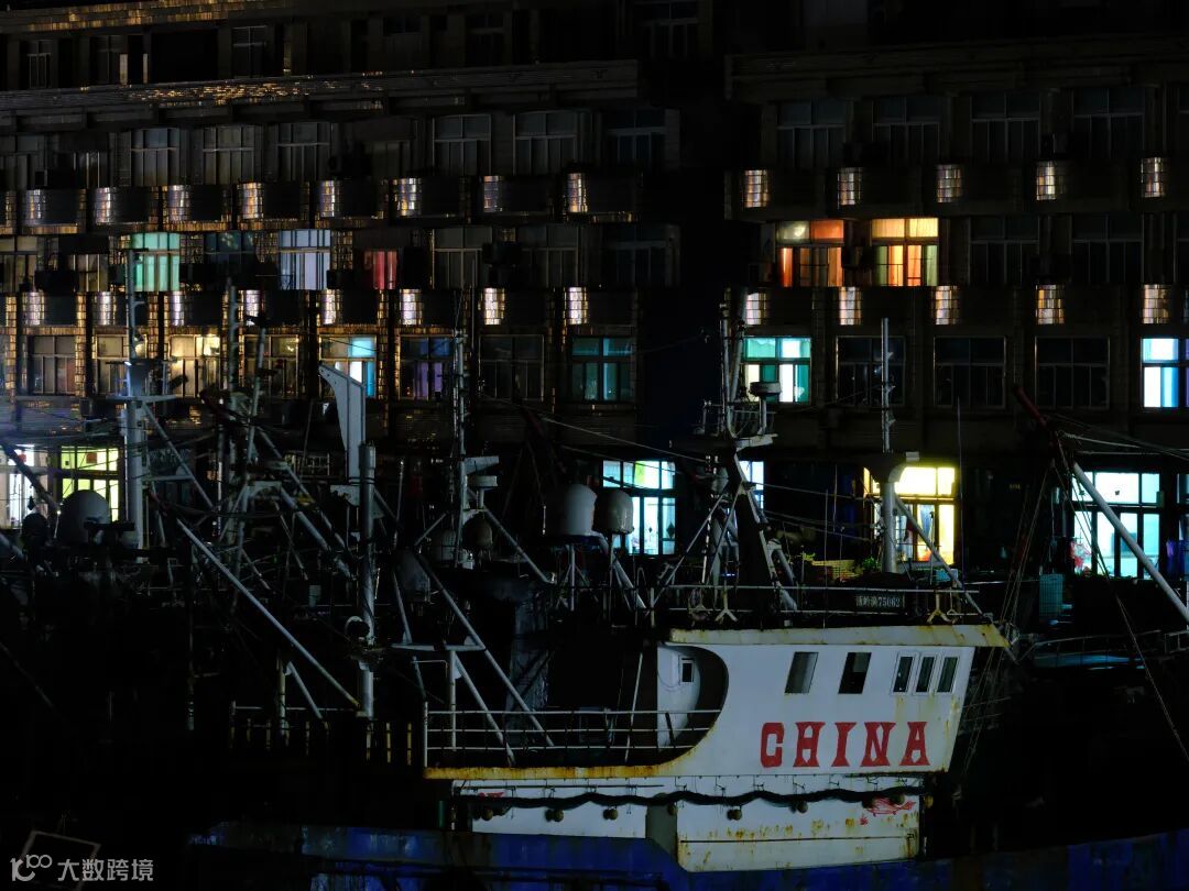 ▲浙江省温岭市松门镇石板殿码头,因为冷空气渔船都进港了。晚上横门村里的民房墙上反射着码头上的照明。