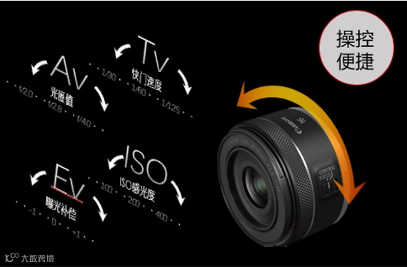 RF16mm F2.8 STM的镜头上配有对焦/控制环* 6。将模式开关切换至控制环模式后,用户可根据习惯将光圈、快门速度、ISO感光度或曝光补偿等功能分配到镜头的控制环上,转动控制环就能调节相应设置,从而大幅提升操作便捷性。对焦/控制环旋转平滑、顺畅。表面采用菱形防滑设计,便于用户凭感觉进行操作。