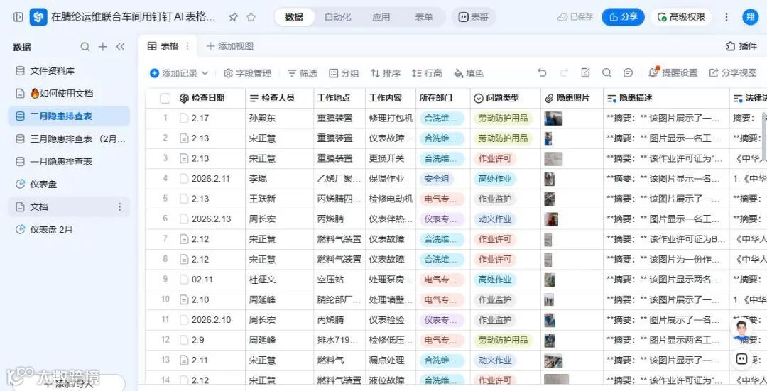 2月份,车间通过小程序排查安全隐患9处,完成整改55处,整改率93%以上,重大隐患实现100%清零,彻底摒弃粗放式管理模式,全面提升安全管控精准性与高效性。