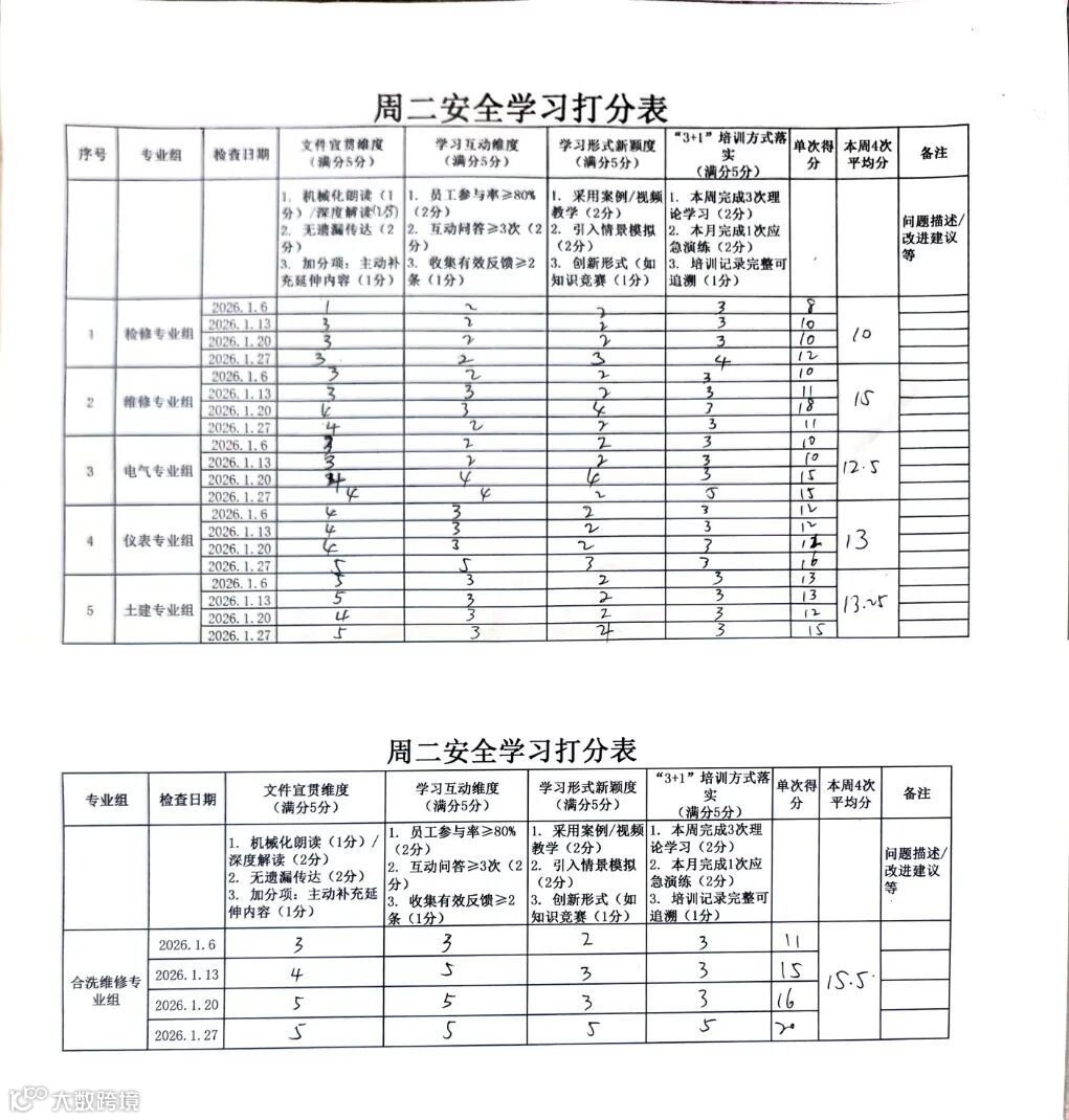同时,车间每个月召开安全评比总结会,全面复盘评选情况,梳理共性问题与管理短板,制定针对性整改提升措施。通过“量化打分+集中复盘”双轮驱动,各班组形成比学赶超、争当先进的良好局面,营造出“人人讲安全、事事争先进”的浓厚氛围。