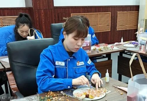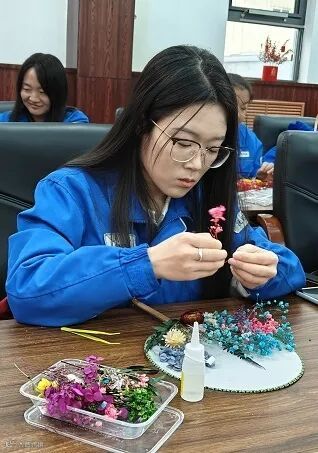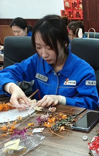 手工环节中,女工们充分发挥想象力和创造力,结合自身喜好,精心挑选干花、搭配色彩,小心翼翼地粘贴、摆放,将自然之美与传统团扇韵味巧妙融合。