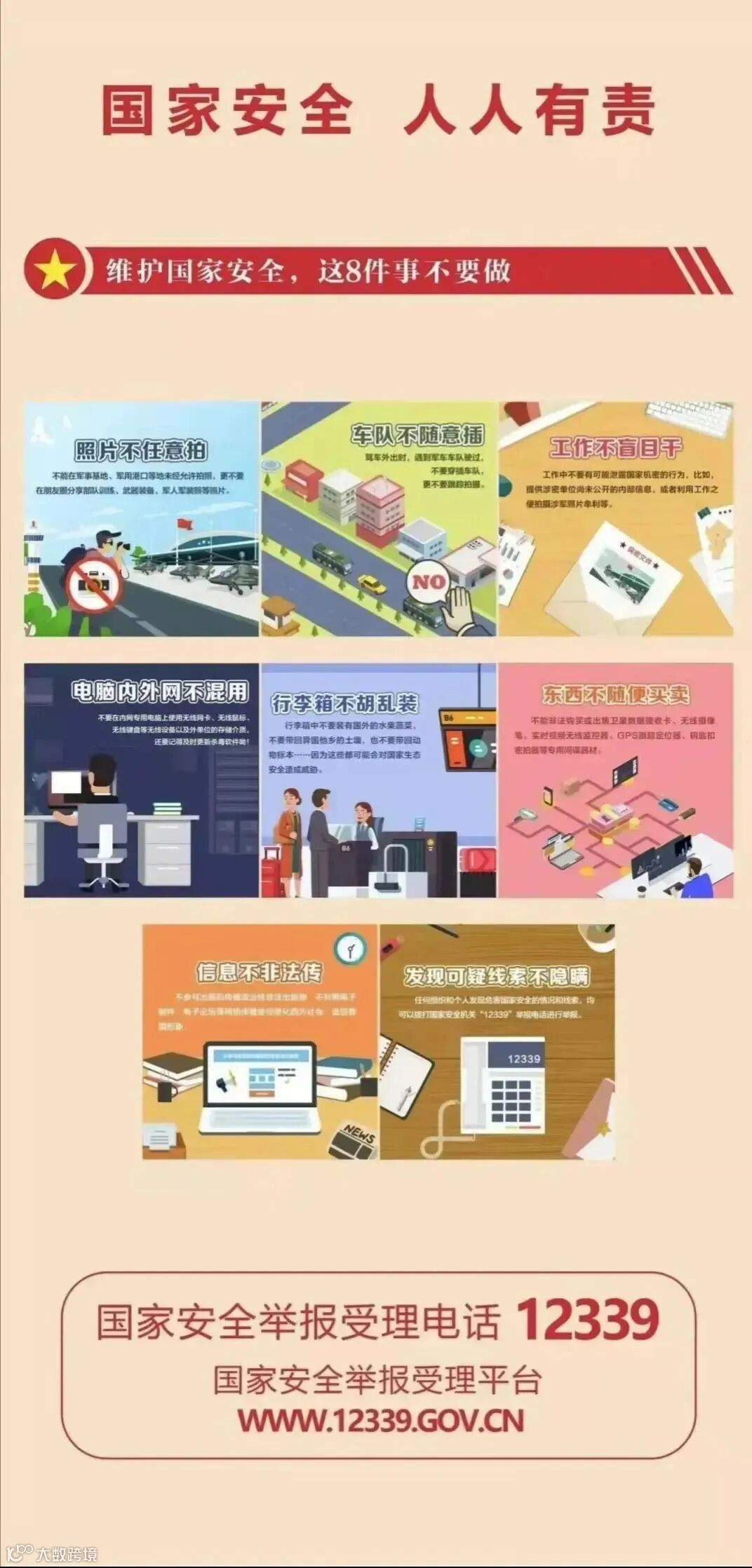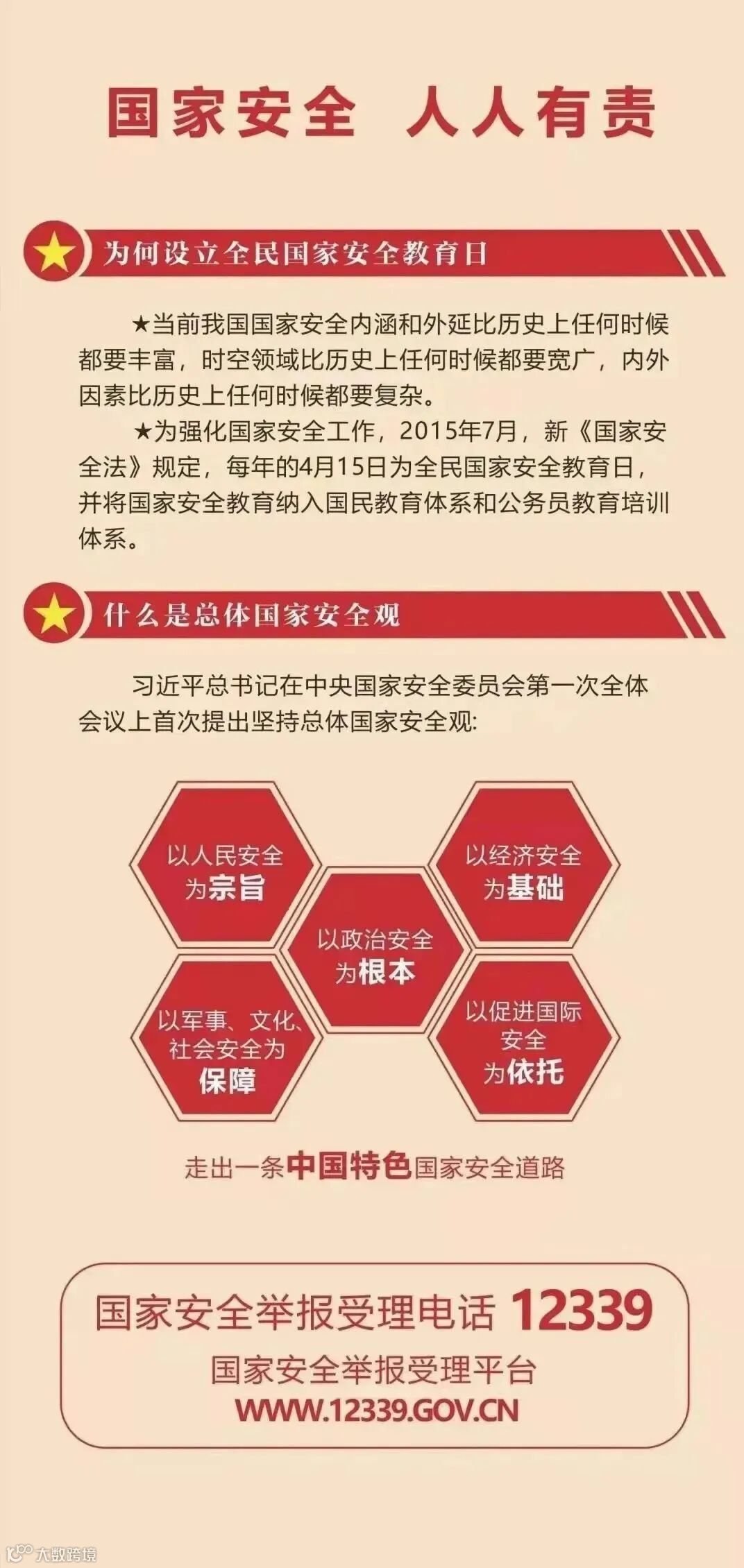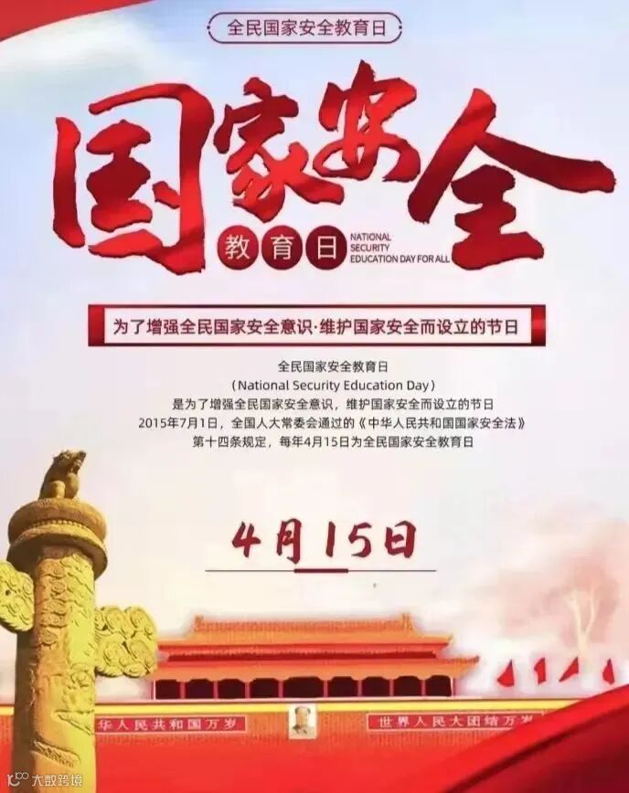 2022年4月15日是第7个全民国家安全教育日,作为公民要了解全民国家安全教育日的由来,了解国家安全所涵盖的政治安全、国土安全、军事安全、经济安全、文化安全、社会安全、科技安全、网络安全、生态安全、资源安全、核安全、海外利益安全、太空安全、极地安全、生物安全、深海安全等16个方面,自觉维护国家安全,坚决远离一切危害国家安全的行为,知晓12339是国家安全举报受理电话。