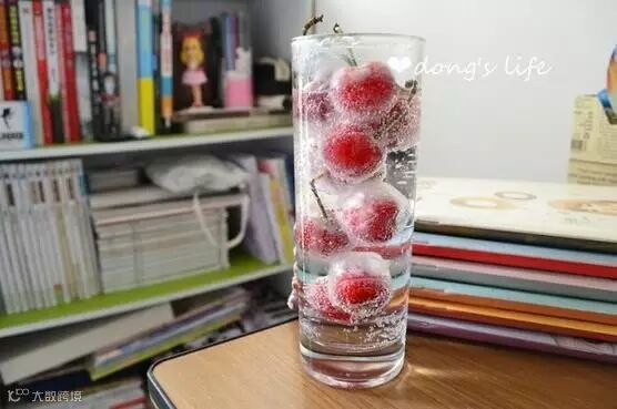 ❷ 需要饮用时,将樱桃冰块取出放入杯子,再倒上雪碧或者其他饮料
