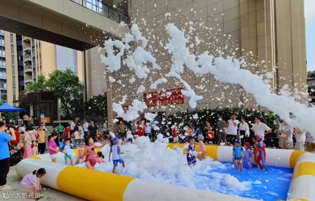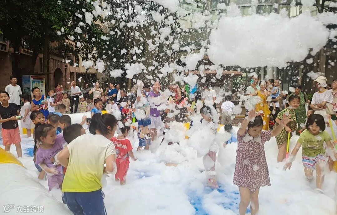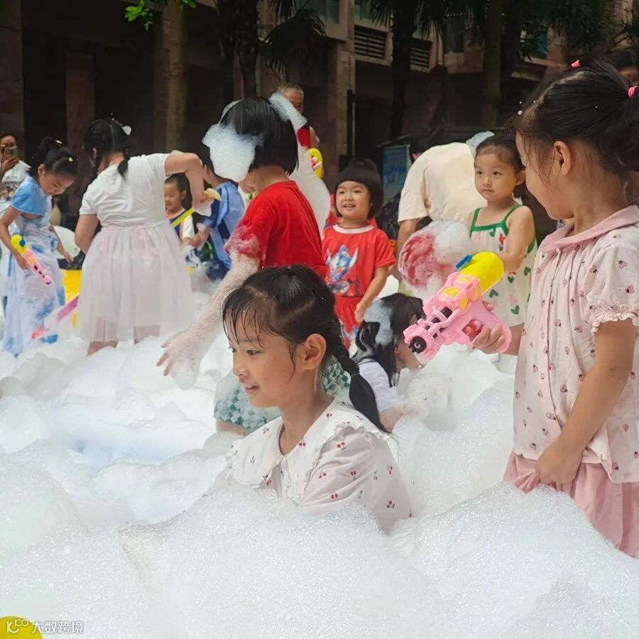 置身在泡泡池中,小朋友们嬉戏打闹,欢笑声不断,在戏水中释放活力,尽情享受泡泡带来的欢乐,感受炎热天气里的一丝清凉。