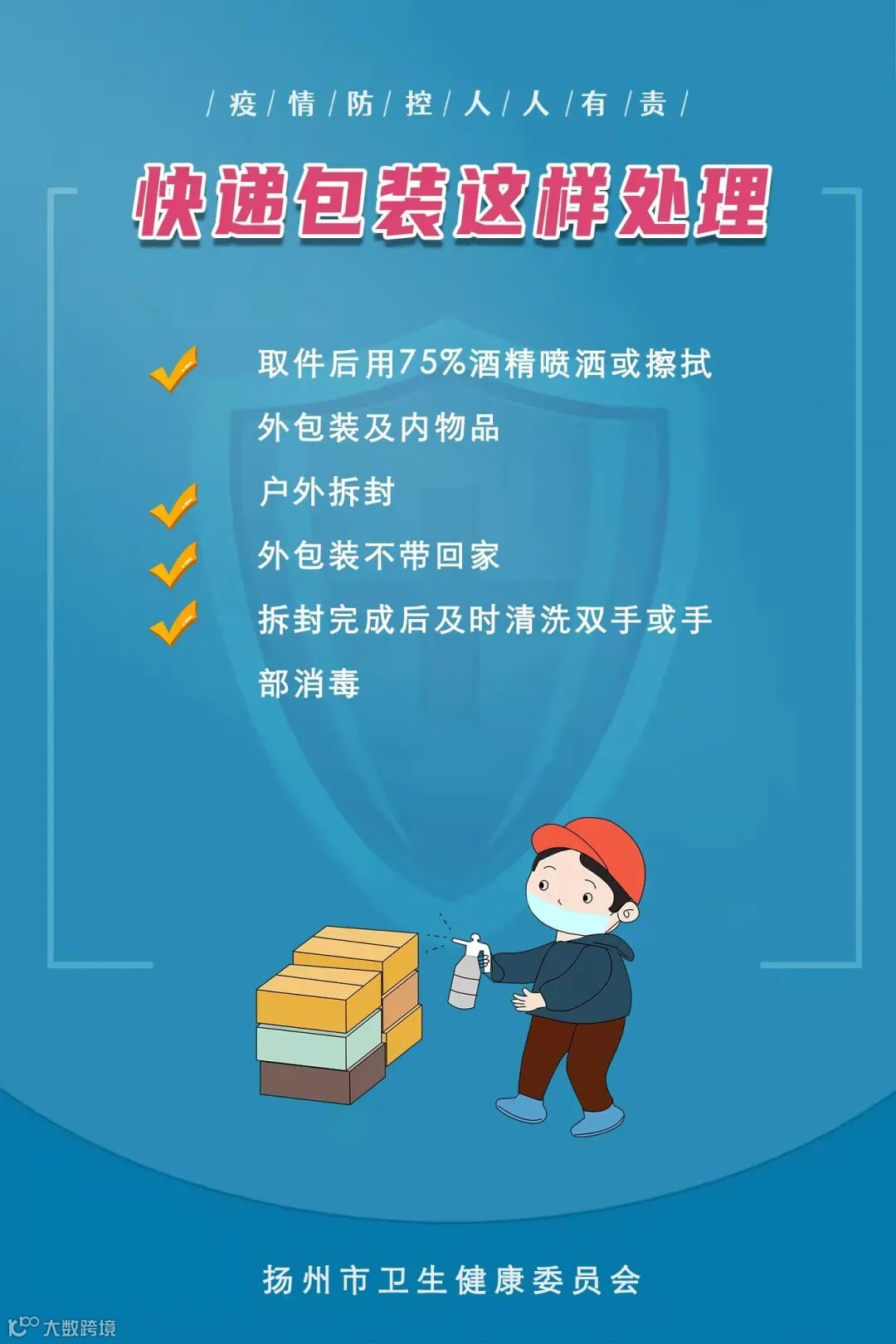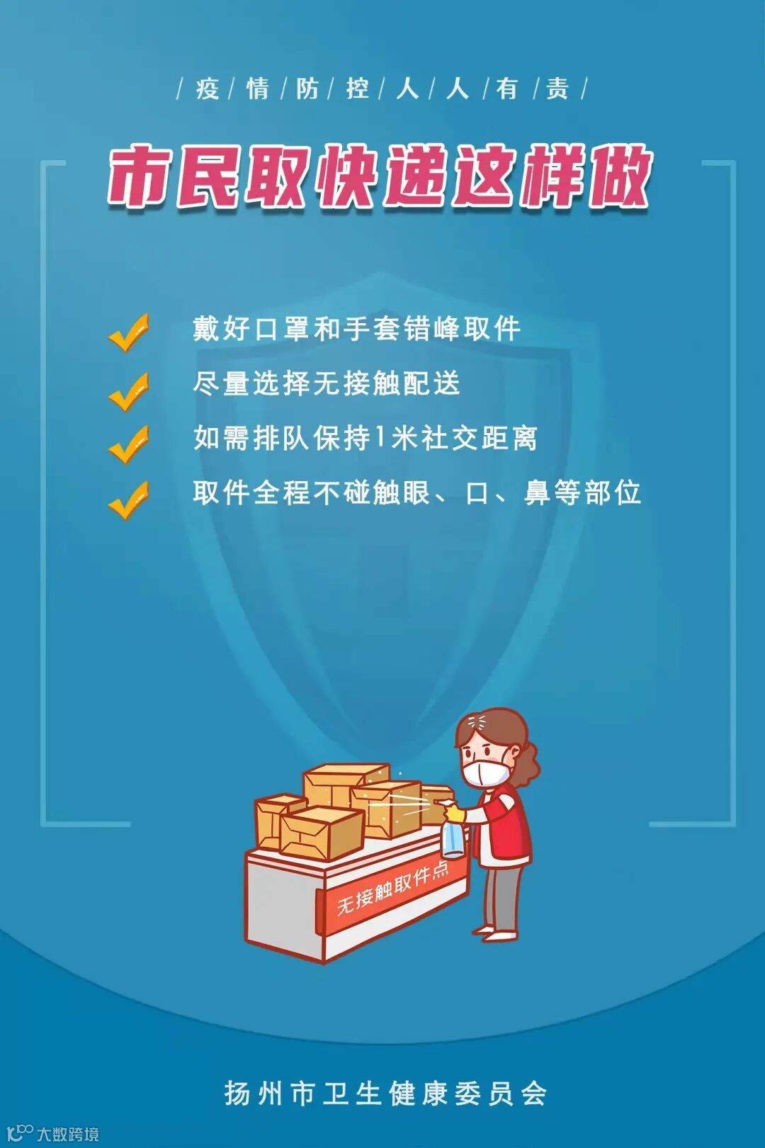 取快递时,戴好口罩,最好佩戴一次性手套,避免用手直接接触快递的外包装。