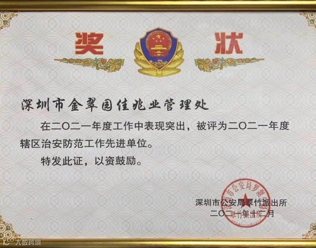 8月22日,深圳分公司金翠园项目被深圳市公安局翠竹派出所授予“2021年度辖区治安防范工作先进单位”荣誉称号,金翠园项目左吉祥也荣获“2021年度辖区治安防范工作先进个人”,治安防范工作获得认可与表彰。