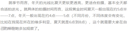 正逆光有时候因为反差过高,会让被拍摄人物过暗,或者人物曝光正常了,背景就过曝了,这样的光线环境就要让太阳偏一点儿,变成侧逆光。