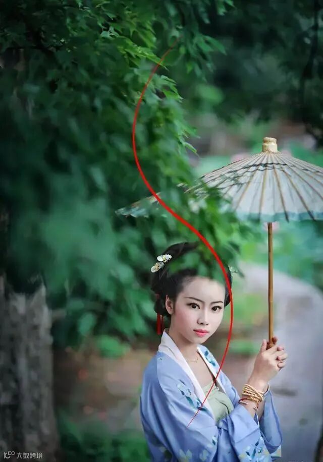 用景物的框架做前景,能增加画面的纵向对比和装饰效果,使照片产生深度感。常应用于古建筑、园林等环境人像。