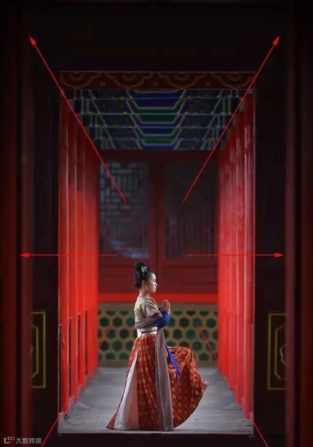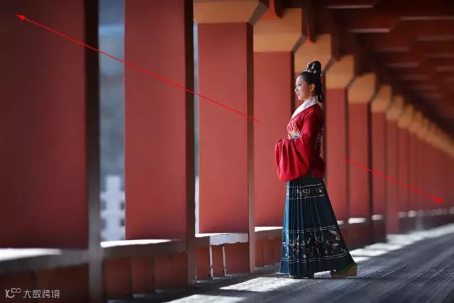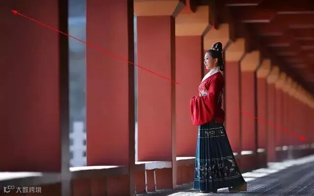 人物的动作和眼神,与背景的长廊呈一对角线,延伸了视觉和空间感。