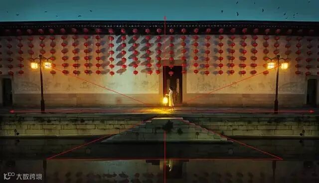 “斜三角”构图:利用广角镜头的视觉和环境中的光影和衬托亮点平衡来表现。