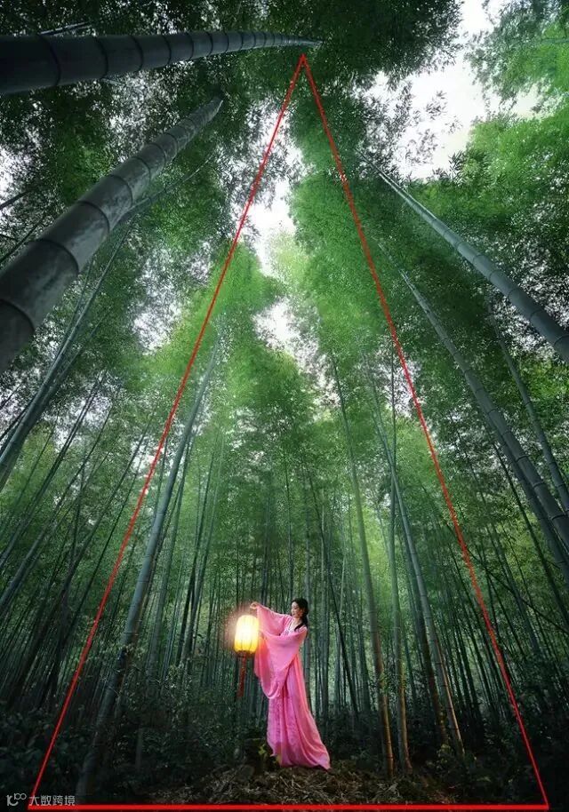“正三角”构图:利用广角镜头的视觉和环境竹林枝杆的视觉变形来表现。