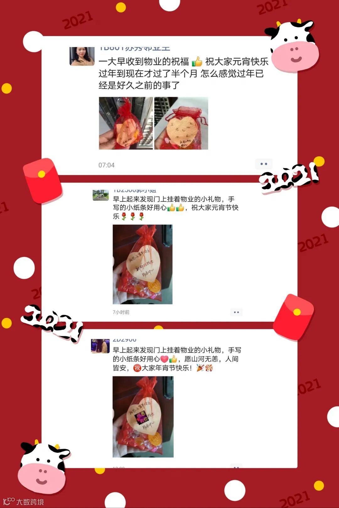 所有的惊喜都来自爱你的人,“佳人”手写祝福语,亲手包装糖果小礼包,并提前将小礼包放置在业主家门把手上。在祝愿业主节日快乐的同时,希望大家在新的一年里甜甜蜜蜜。