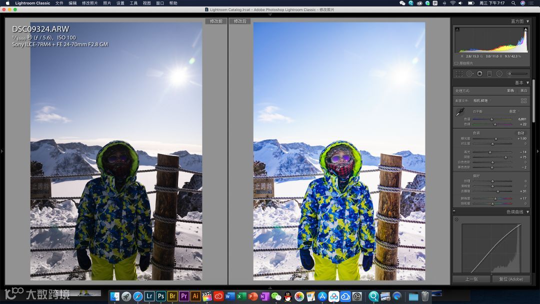 过在天池边上拍摄到此一游的留念倒不是那么顺利,因为现场光比实在太大了。当然好在索尼微单Alpha 7R IV的宽容度一如既往的给力,所以拍摄时我尽量保留了高光细节,通过后期强行提升照片的阴影。具体修改的参数和修图前后对比如下图: