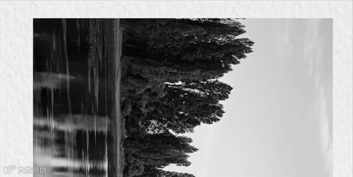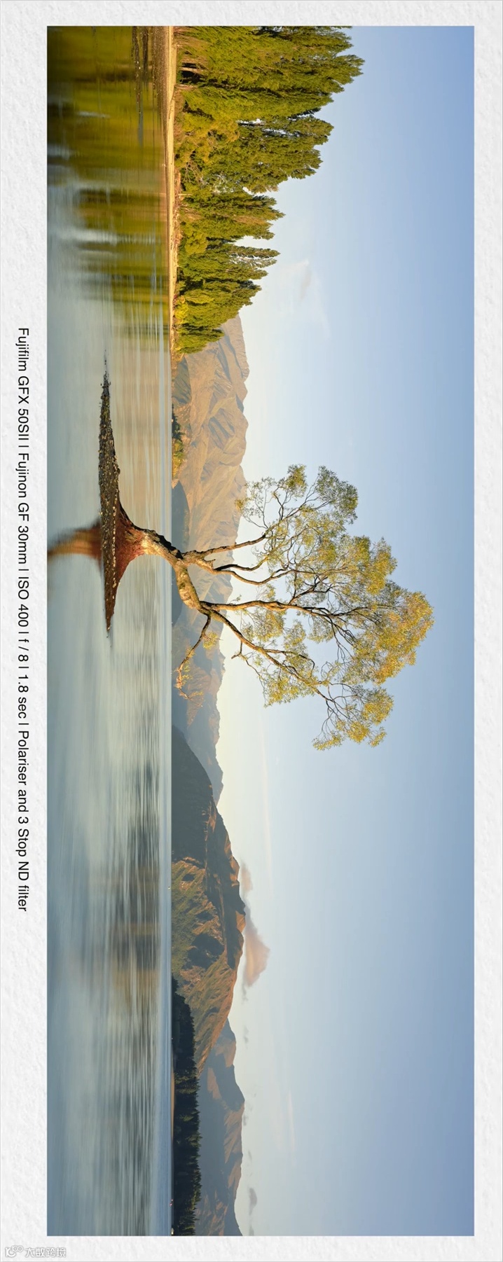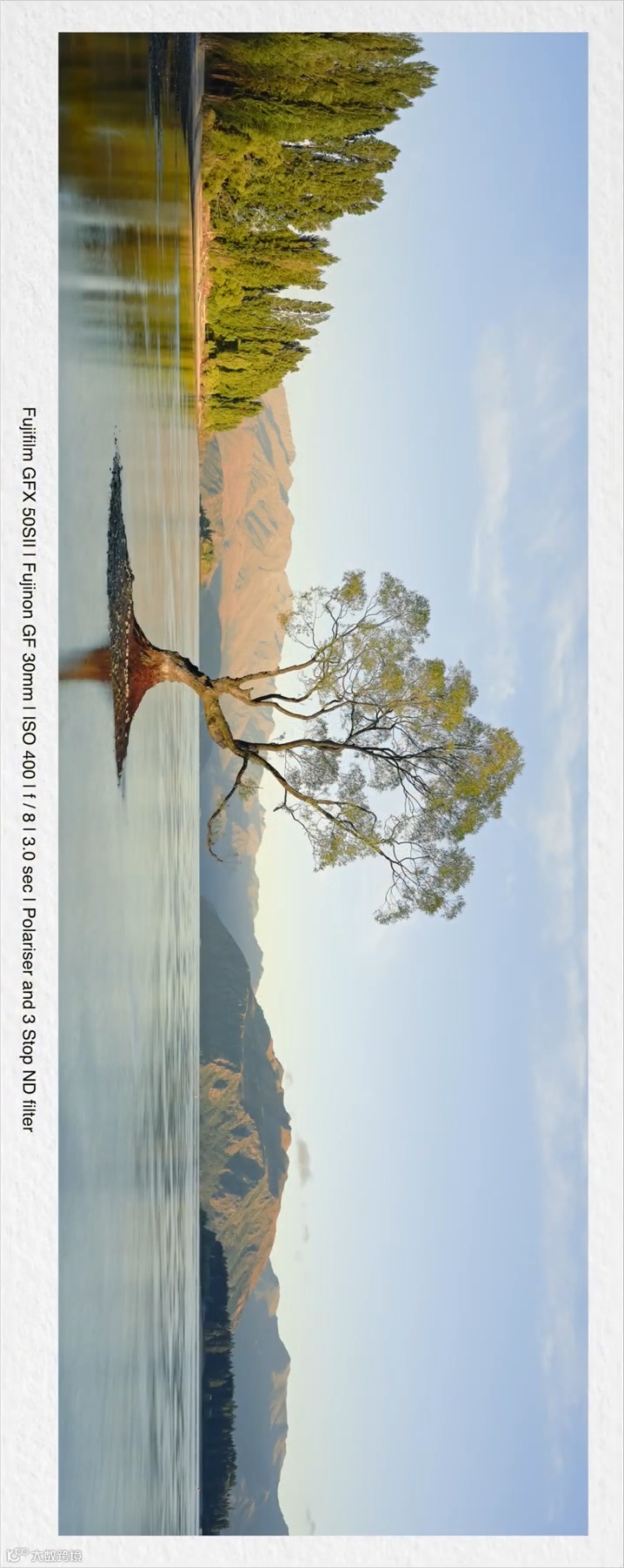 画面中,树和水中的倒影可以形成呼应,然后再来一张全景照片。我不会将反光拍进画面,而是将树放在画面的左边,远处的山脉呢,放在右边,我们现在需要做的就是等待光线,拍下完美的照片。