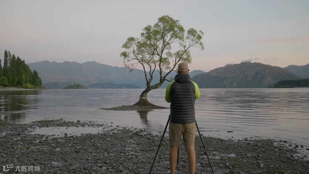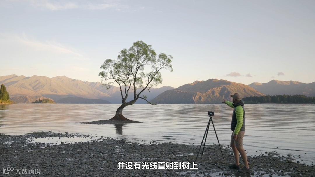 我今天希望能够拍到日出光辉下的瓦纳卡树,水面的反光非常清晰。今天早上的天气堪称完美,太阳正在画面的右边,也就是我的左手边升起,日出的阳光将会从正面照亮这棵树,还有后面的山脉。远处应该还能看到美丽的金星带,远处的天空还有不少的高层云,它们被日出照亮时也很好看。