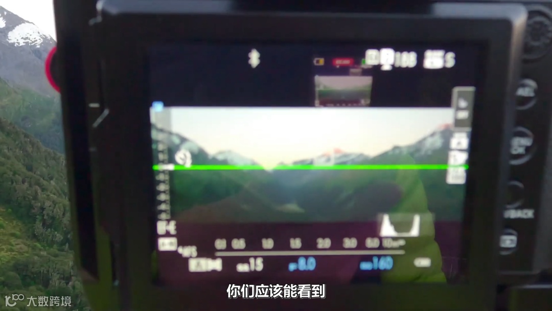我准备使用这支镜头的最大光圈值也就是F3.5进行拍摄,对焦点依旧保留在树上。这样,就可以将它从背景的群山中“分离”出来更有辨识度。我们之前使用的是自动对焦,现在我来切换到手动对焦,看看对焦点,保证焦点的清晰。