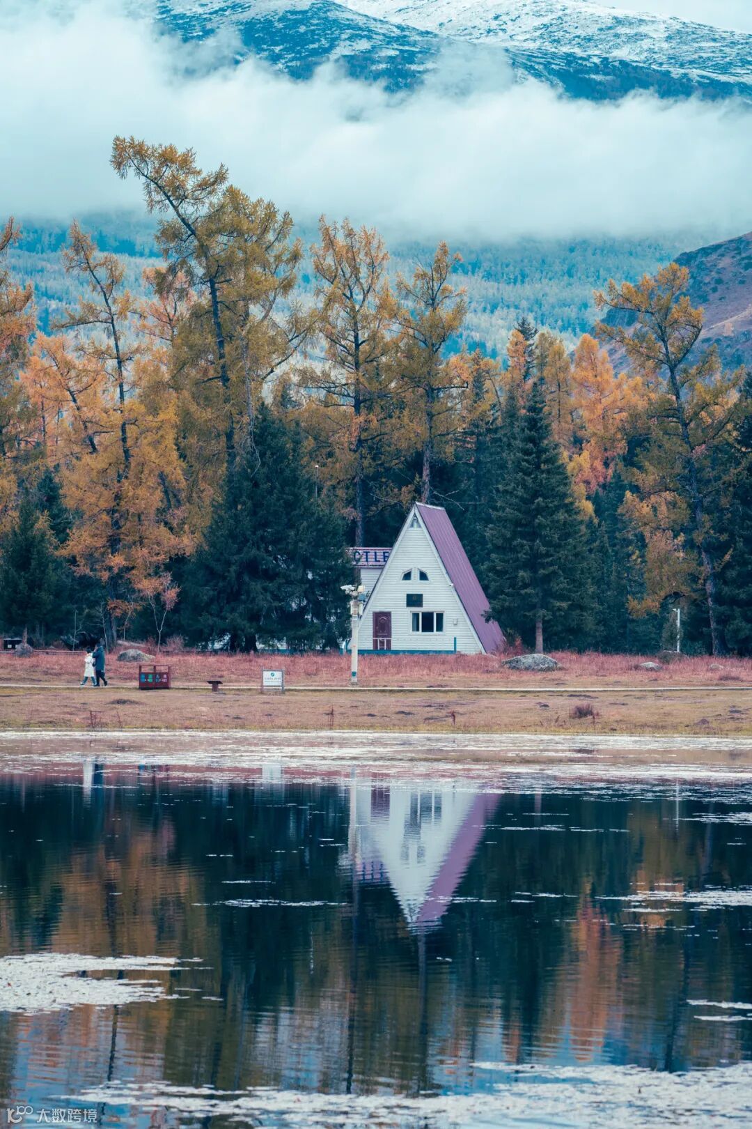 在河对岸,就注意到了远方的雪山,然后寻思着如果有好的目标,即可拍到心中的画面。前后探索的过程中,遇到了一座紫色的木屋(难以想象居然是一个卫生间),在雪山和黄色的树林中,格外醒目。利用房子前方的湖面,一张对称的作品诞生了。