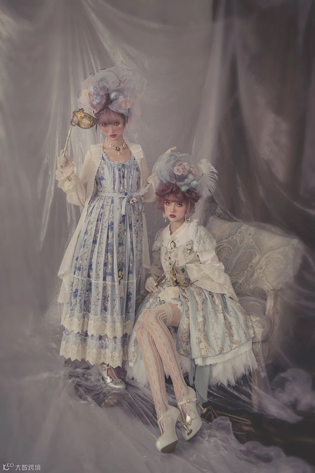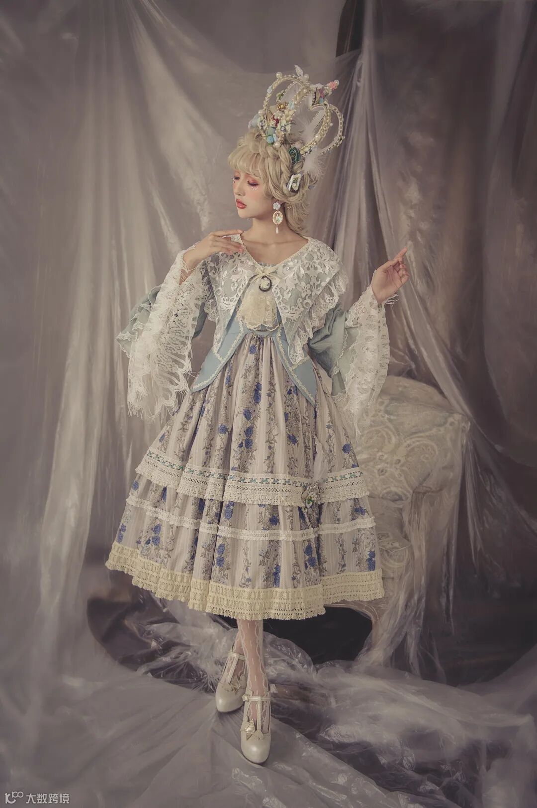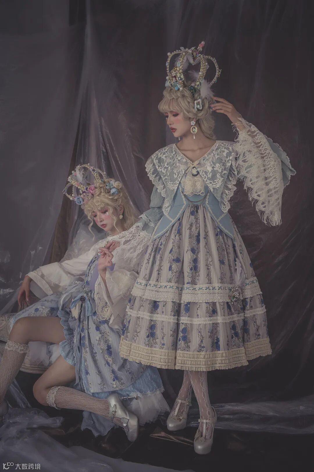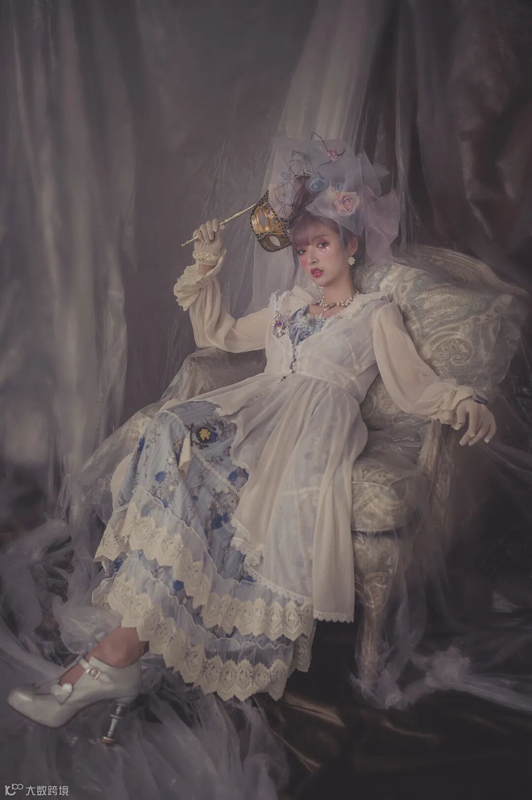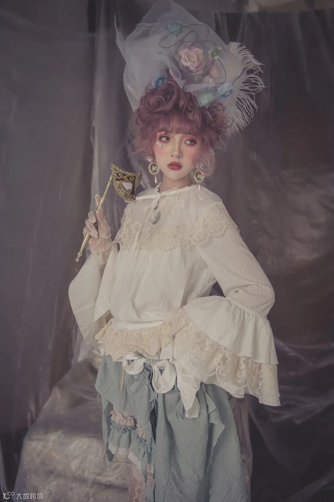 蕾丝、层层叠、不规则裙摆,还有做旧色的棉料,在弱光下呈现出复古的调子,这是本次拍摄的创意核心。为了烘托这样的调性,布景方面,考虑到整体服饰都是浅色,又要弱光,于是选择了水泥墙背景,再叠上一层胶膜,让水泥墙面显得比较柔和。同时,借助环境光中的漫反射效应,进一步让整体光感更加柔和。