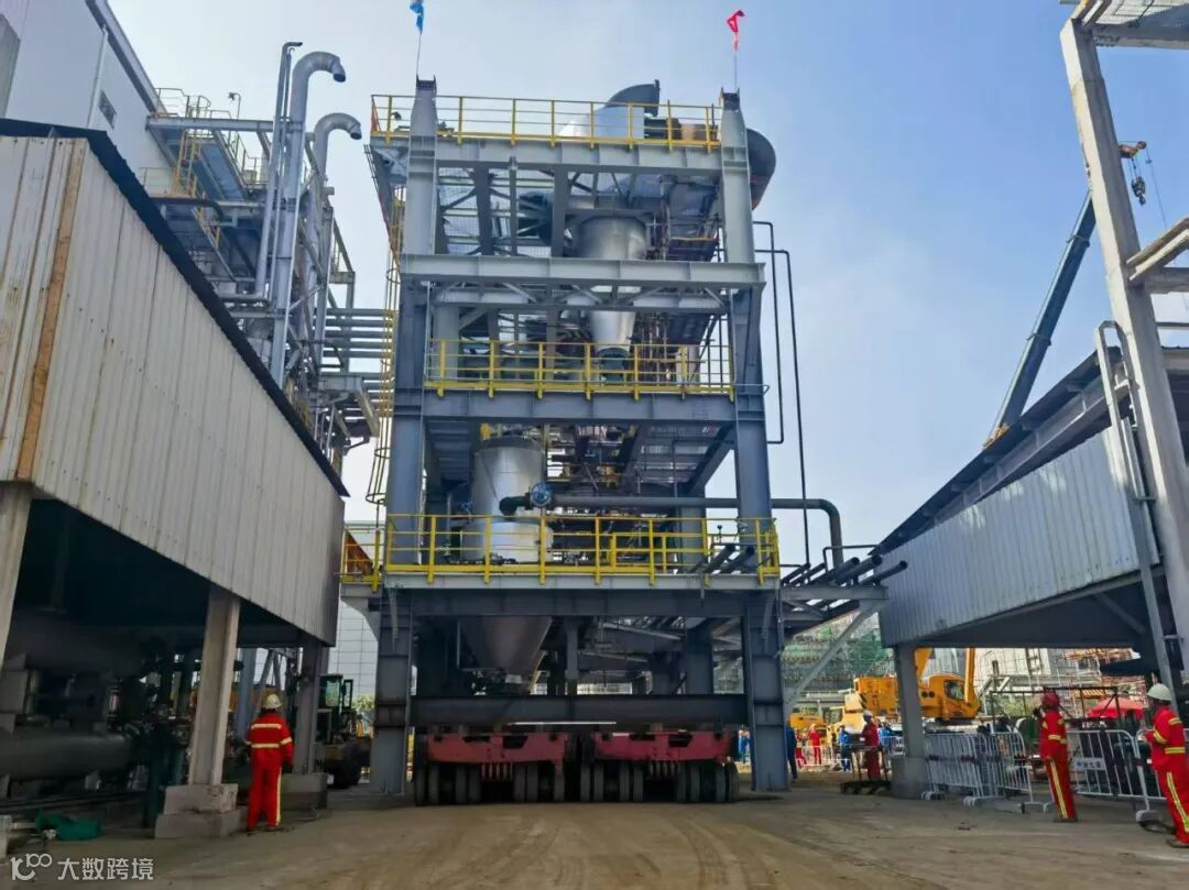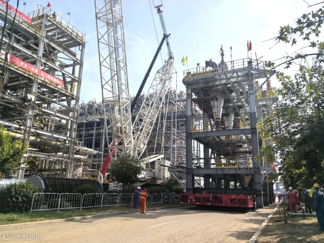 9月8日,烯烃厂80万吨/年乙烯装置脱瓶颈改造及能效提升项目迎来关键节点,8时38分,乙烯装置全新急冷单元ST-2005急冷油过滤框架由轴线车运输,沿东西主马路途经裂解、压缩、分离等单元,在裂解气压缩机机房和乙烯机、丙烯机机房之间驶入急冷单元。
