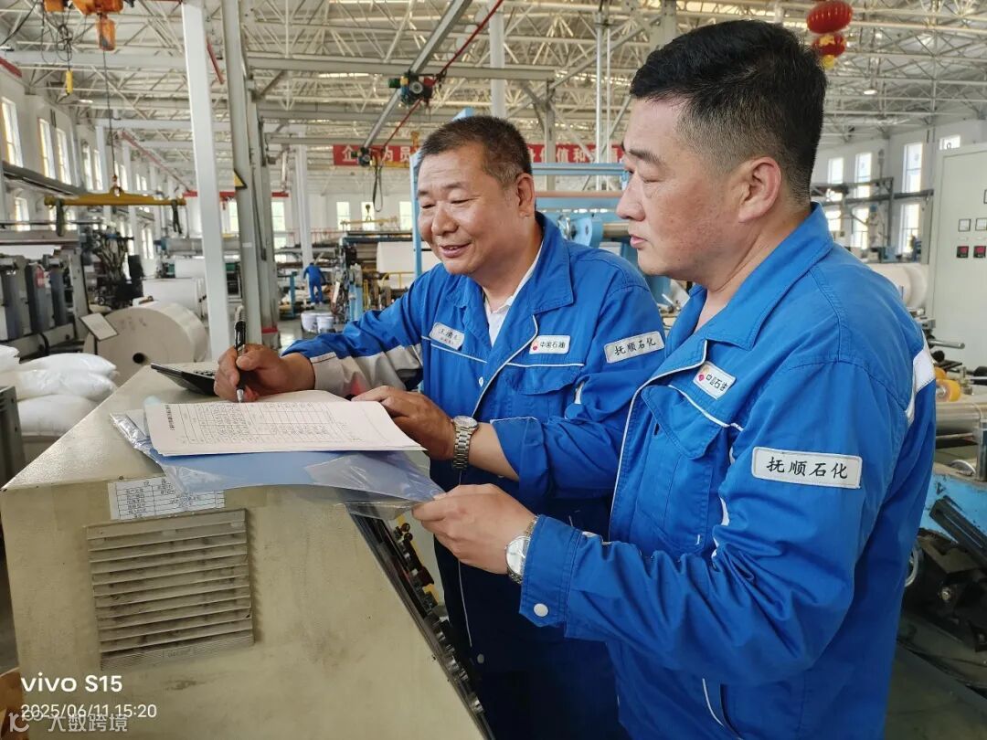 包装公司着重科学管理,向工艺要效益,优化工艺参数。涂膜工序长期依赖燕山石化生产的EC7A原料,其性能稳定、适配性强,是保障编织袋涂膜质量的关键。今年因燕山石化搬迁EC7A原料供应链中断,包装公司迅速成立攻关小组,经过多轮筛选比对,将目标锁定大庆石化19G原料。为验证该原料的适配性,技术人员开展了数十组对比实验,从熔融温度、涂膜附着力、耐候性等核心指标反复调试生产参数。历经半个月时间,19G原料替代方案最终通过验收,各项检测指标均达到甚至优于原标准并降低了原料采购成本,为企业高质量发展注入了新动力。