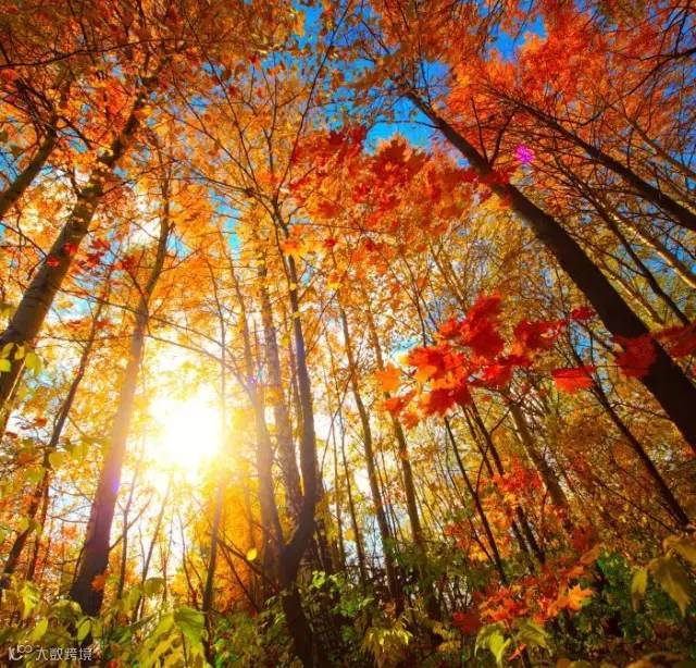 秋天的天空特别清爽明朗,晴朗的蓝天与叶子的颜色形成强烈反差,可以使叶子看上去更加艳丽。