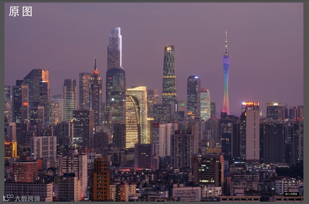 首先,前期拍摄时要在太阳快要完全消失的时候开始拍摄,即要在蓝调时刻到来前一刻就要开始记录画面,千万别等天色全黑后才拍摄,目的是能更有效把建筑的细节保留下来,刚好华灯初上,这个时候的城市夜景是最为美丽的。如下图,是在广州白云山上使用索尼FE 70-200mm F4 G长焦拍摄的城市夜景,拍摄时间在傍晚6点多的时候,从原图可以看出当时天色是未完全暗下来的,这个时间点也是不比蓝调时刻所拍摄的夜景效果逊色的。