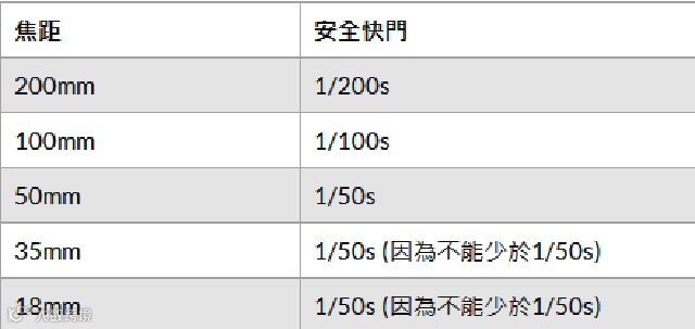 我们来看一看不同焦距镜头所对应的安全快门数值吧: