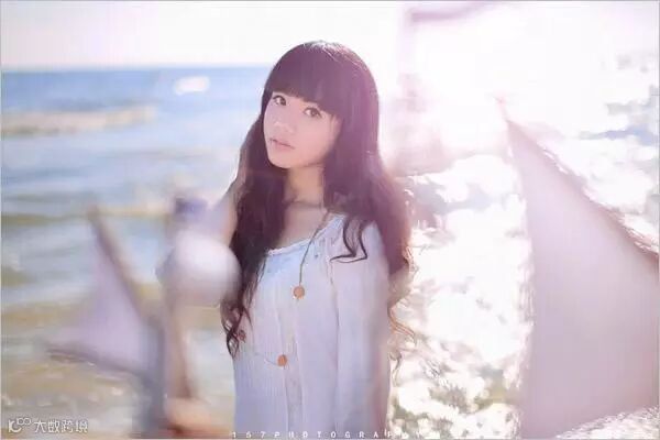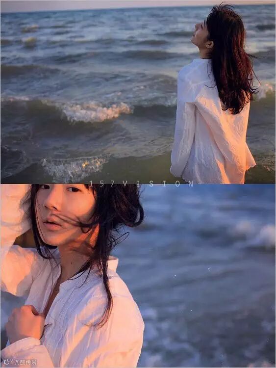 想描述一个恬静但有心事的少女心情,服装颜色选择简单的白,既能映衬少女的纯净,又不抢戏,让目光更多放在人物表达和情绪上。同样为了丰富层次,远近结合,用了24-70和50-1.4两个镜头。在拍摄时用大光圈突显海面波光。