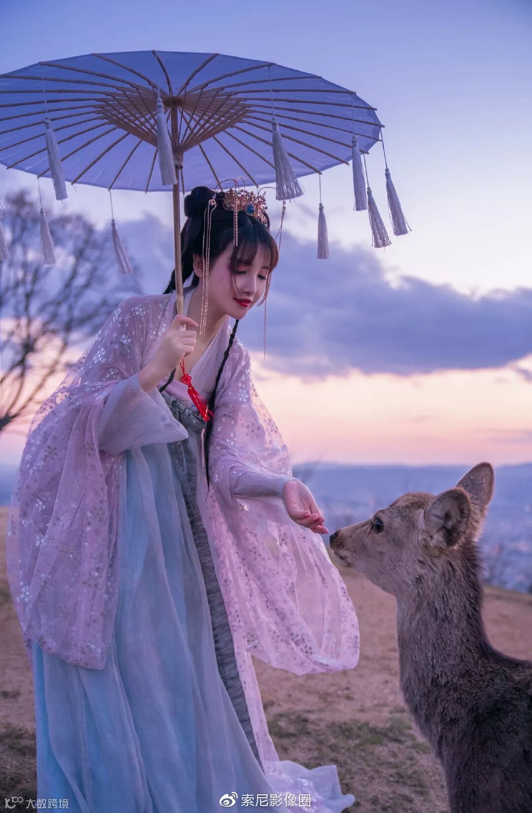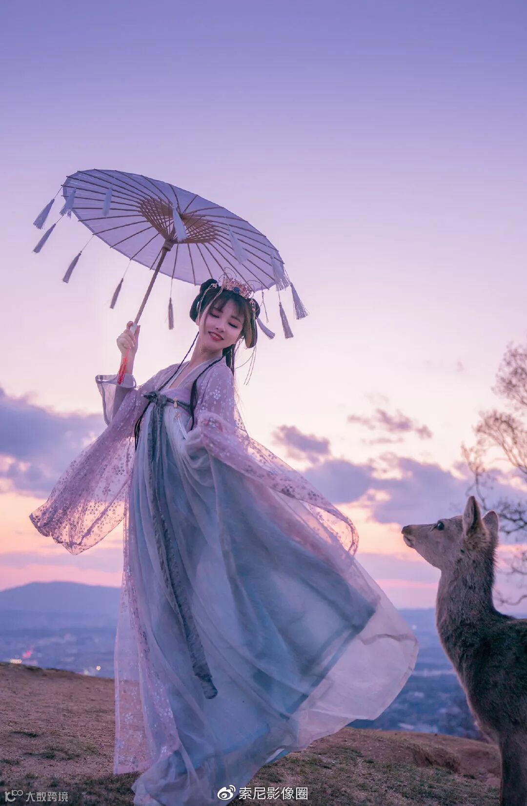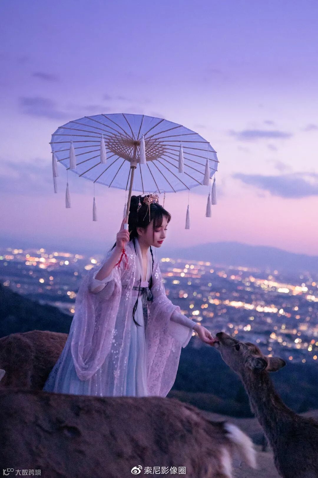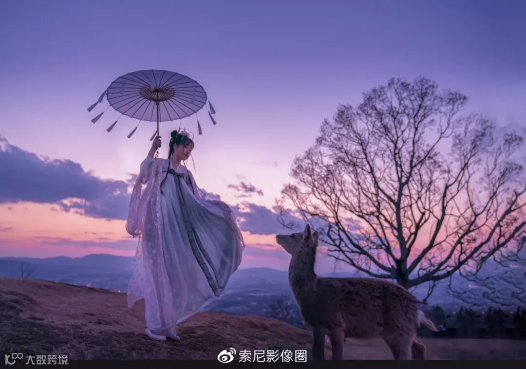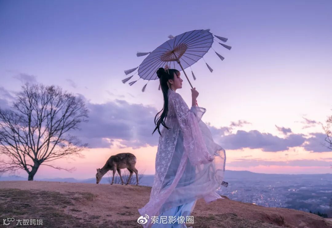 来到日本关西的第一天,我们在日落前赶到了奈良的若草山顶。太阳眼见就要落入地平线,我使用了索尼Alpha 9和FE 24-70mm F2.8 GM镜头,在非常短暂的日落时分拍摄了这组小鹿和汉服人像。