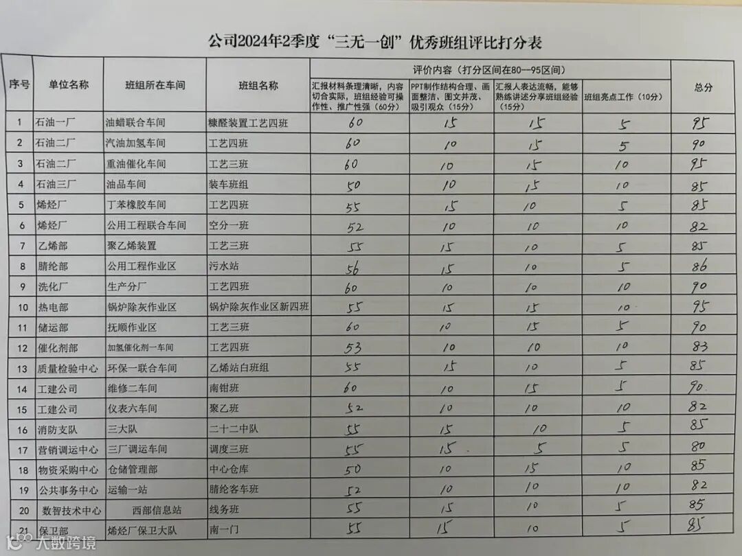 班组长汇报结束后,评委进行现场提问,班组长进行作答。评委结合汇报内容、答辩情况、PPT制作质量、讲述流畅程度、汇报人精神面貌等对其打分。