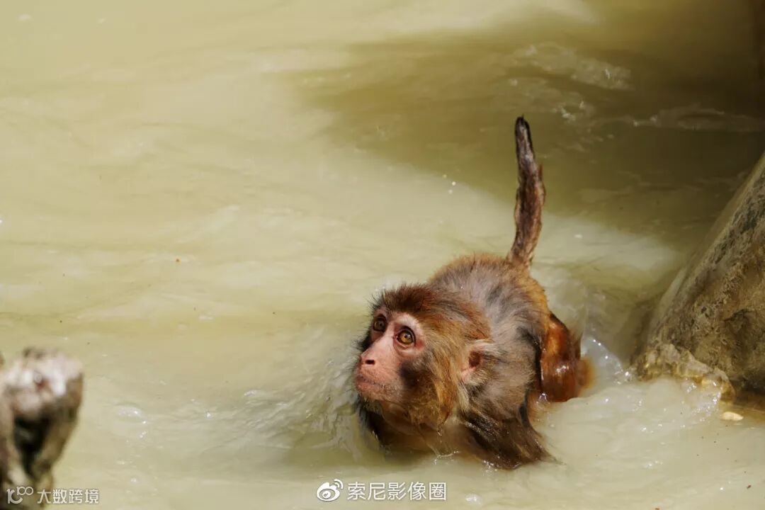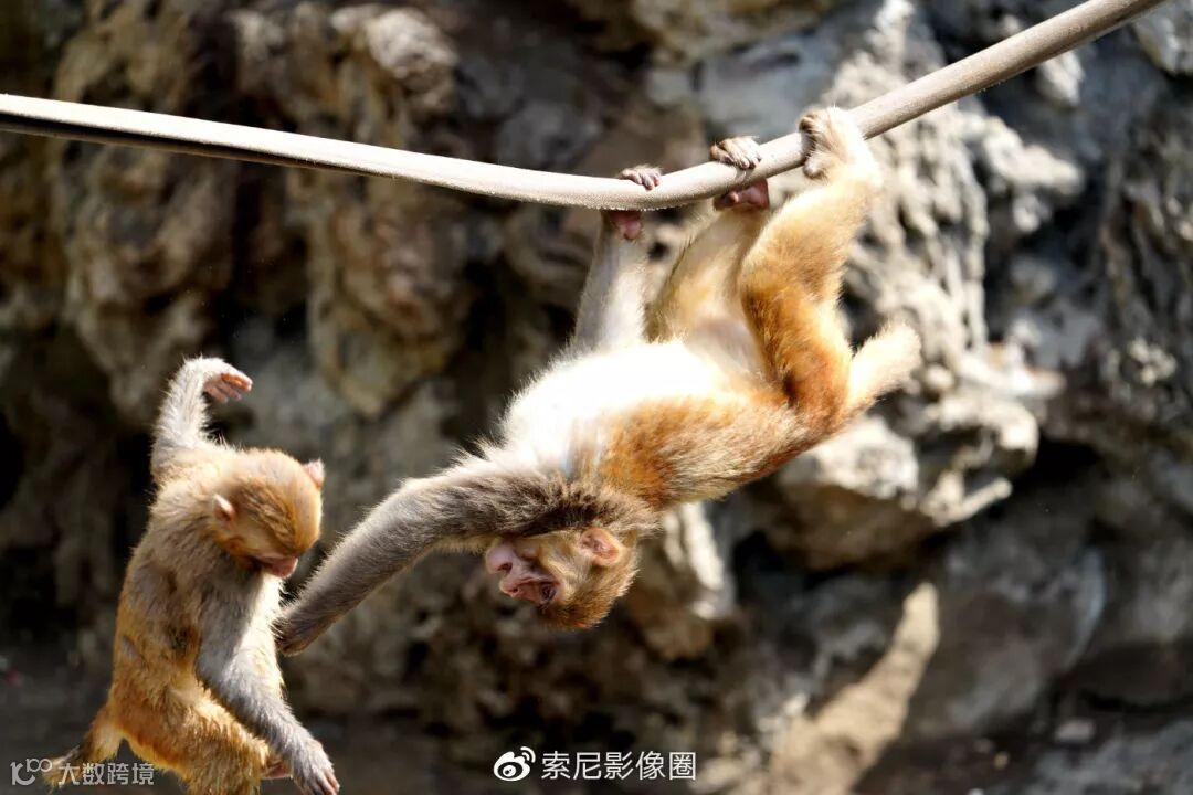 相比于封闭管理的国宝,花果山之王就要自由多了,硕大的猴山里有多只大师兄上蹿下跳,完全不顾烈日高温。