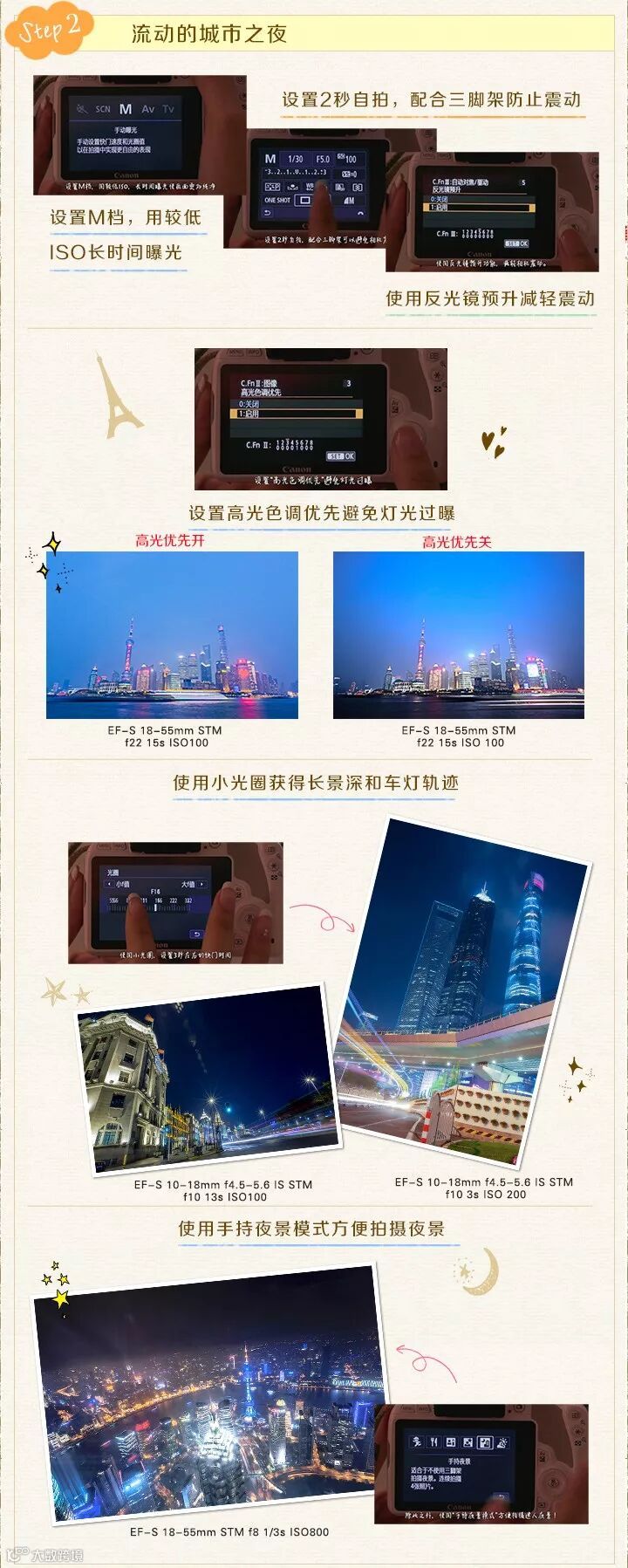 ✦ 设置M档,用较低ISO,长时间曝光使画面更加纯净,设置2秒自拍,可以避免相机震动,设置“高光色调优先”避免灯光过曝。使用小光圈,设置3秒左右的快门时间,可在带来较长景深的同时,捕捉车灯轨迹。除此之外,使用“手持夜景模式”方便拍摄迷人夜景,该模式连拍4张,最后能够合成一张画面纯净的照片。