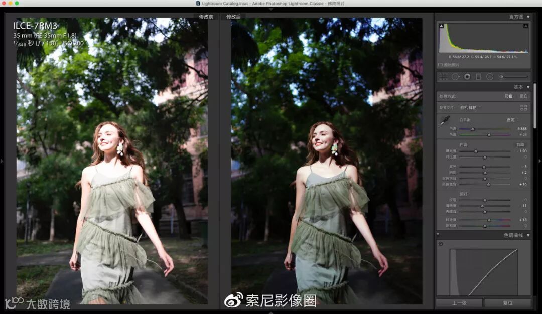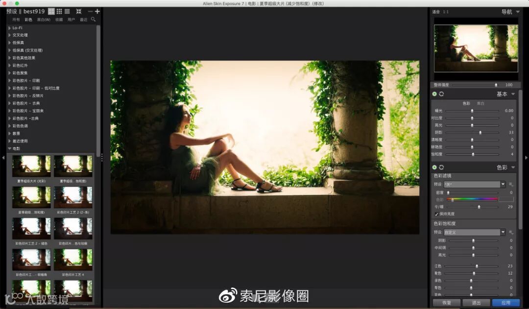 后期部分,一开始我只是色彩校正,使用自己制作的色彩校正预设来还原现场的色彩。后来觉得这样的色彩太朴实了,有点浪费这欧式的环境和漂亮的外国小姐姐,于是我又套了电影滤镜。调色的思路也很简单,直接在PS里面打开胶片滤镜EXPOSURE7,选择电影、夏季超级大片即可。套用滤镜之后,在右边稍微增加了一点暖调,减少了暗角。