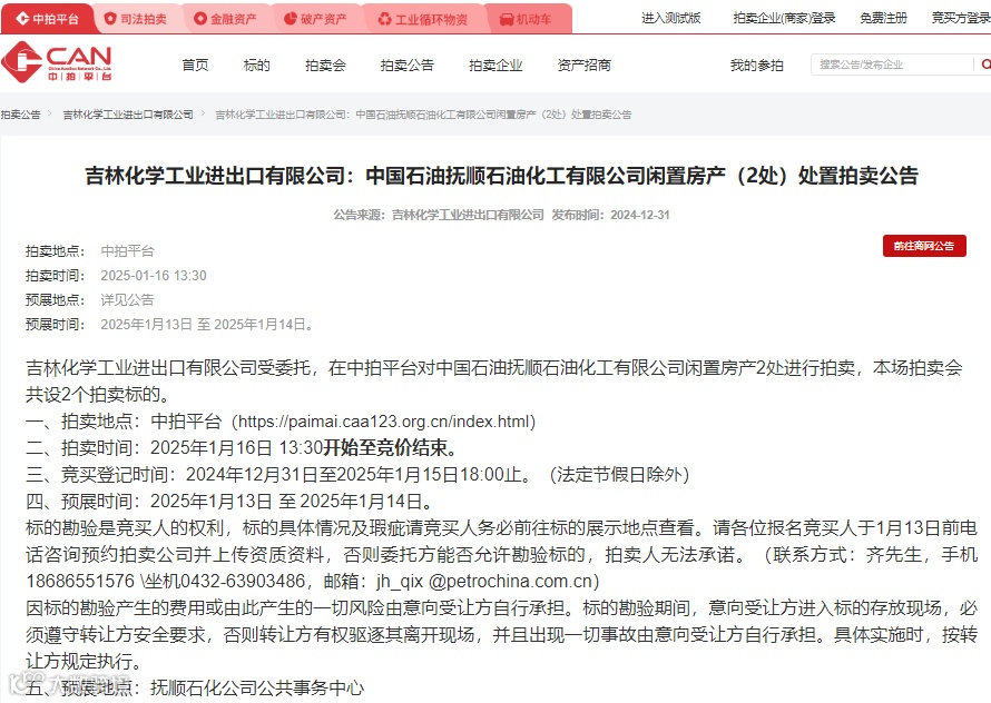 经抚顺石化公司党委会研究决定,集团公司备案批复,抚顺石化公司原腈纶幼儿园和腈纶液化气站土地使用权及地上建筑物进行处置。目前,已委托吉林化学工业进出口有限公司在中拍平台对这两处闲置房产进行拍卖,本场拍卖会共设2个拍卖标的。