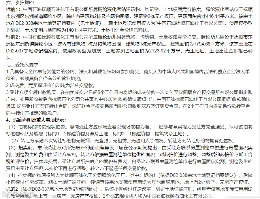 标的2:中国石油抚顺石油化工有限公司所属腈纶幼儿园建筑物、构筑物、土地权属竞价拍卖。腈纶幼儿园位于抚顺市东洲区东洲街道腈纶小区,院内有建筑物1栋及构筑物围墙,建筑物1栋无产权证,建筑面积为1794.68平方米。该宗土地在D02-037宗地登记档案内,使用权类型为划拨,土地实测占地面积为2123.02平方米,无土地证,土地出让金价格已确认。