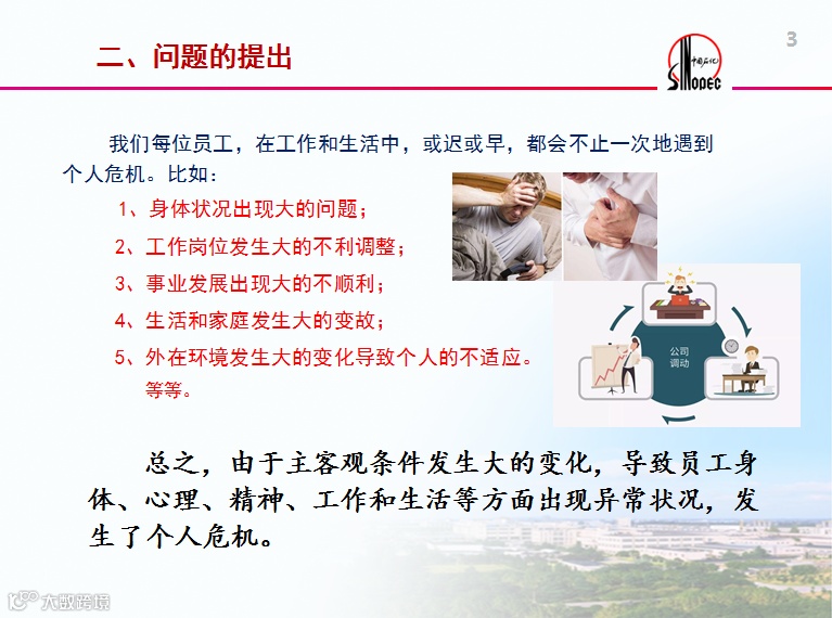 当前,我们国家正处于经济社会的转型发展期,我们企业改革也处于深入推进的攻坚阶段,员工队伍的思想观念更加多元化,利益诉求更加复杂多样,各种的心理健康问题进一步凸显。怎样来帮助我们职工提高心理素质,培育自尊自信,理性平和,积极向上的良好心态,理顺情绪,化解矛盾,凝聚共识,为推进企业改革发展注入正能量。这是工会工作当前面临的一个新课题。