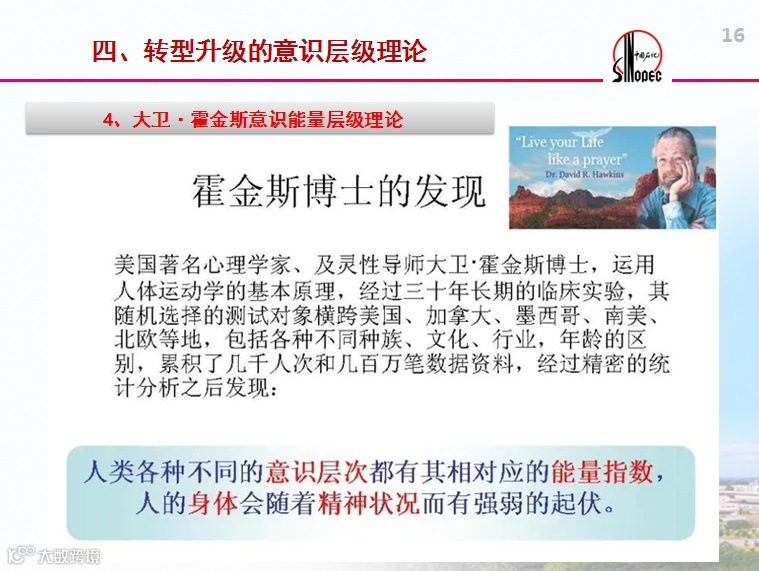 如从寂静法师的完整生命五个层次理论,马斯洛需求层次理论、心灵成长四个阶段,大卫·霍金斯意识能量层级理论等四个方面,详细解读了关于“转型升级”的意识层级理论,让听者有豁然开朗之感。